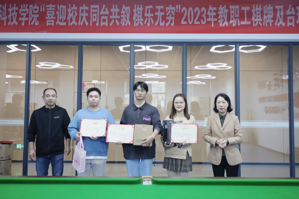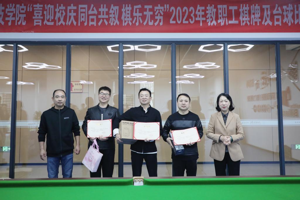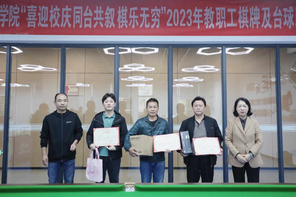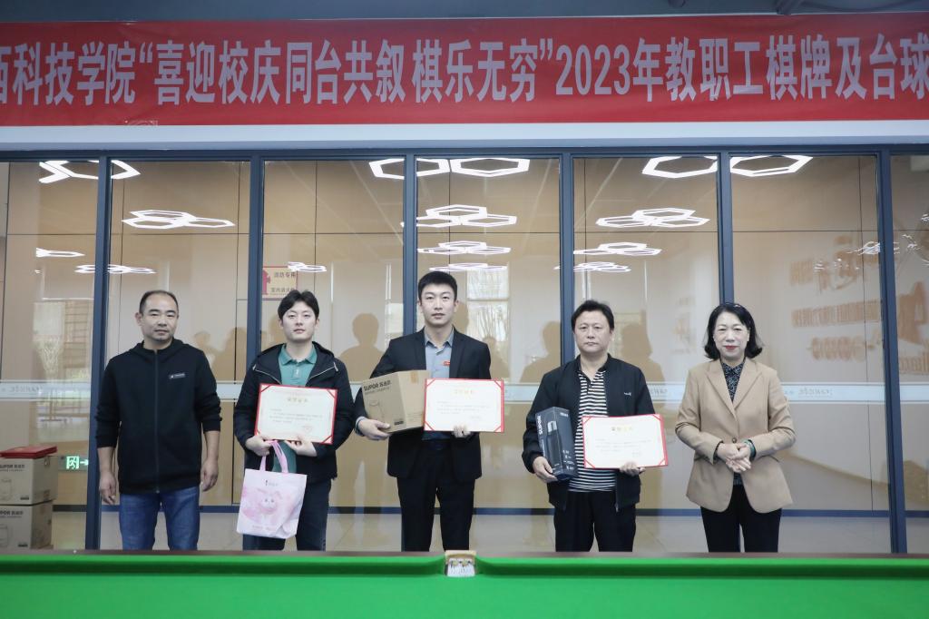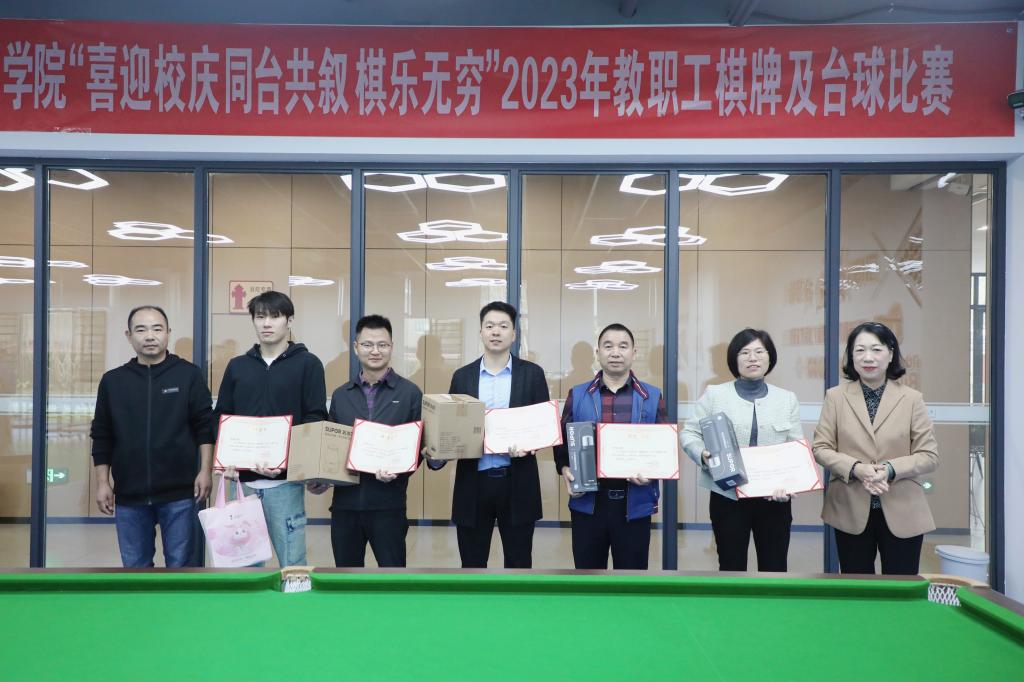 经过一轮轮的精彩比拼,最终马克思主义学院分会的全秀、机关二分会的喻小兰、管理学院分会的范磊获得跳棋比赛的一、二、三名,马克思主义学院分会的祝永良、机关七分会的李勇军、城市建设学院分会的相秉志获得象棋比赛的一、二、三名,机关五分会的丁光辉、机关七分会的刘浩、教育学院分会的肖有福获得围棋比赛的一、二、三名,财经学院分会的彭劲松、管理学院分会的魏琬昕、艺术设计学院分会的熊志鹏获得五子棋比赛的一、二、三名,机关二分会陈新亮和江道明、机关四分会元文琴和李冬权、体育学院分会的周林和周予墨获得升级(扑克牌)比赛的一、二、三名,机关二分会的胡宝钢、机关七分会的刘浩、教育学院分会的肖有福获得台球比赛的一、二、三名,马克思主义学院分会、机关七分会、管理学院分会、机关二分会获得优秀组织奖。林素君副校长为获奖个人和集体颁奖。