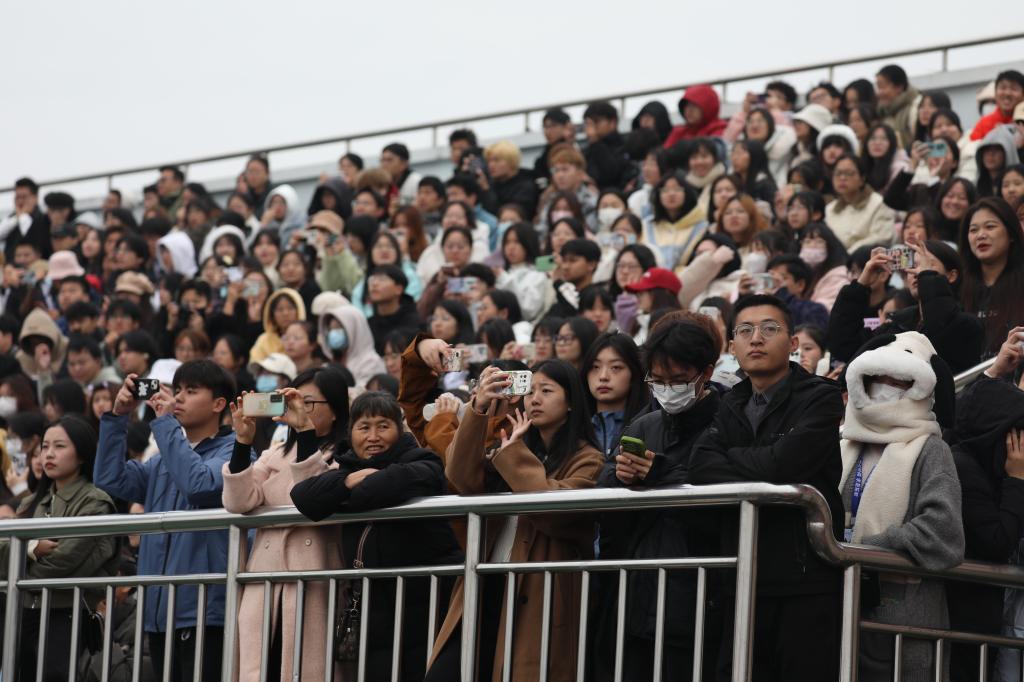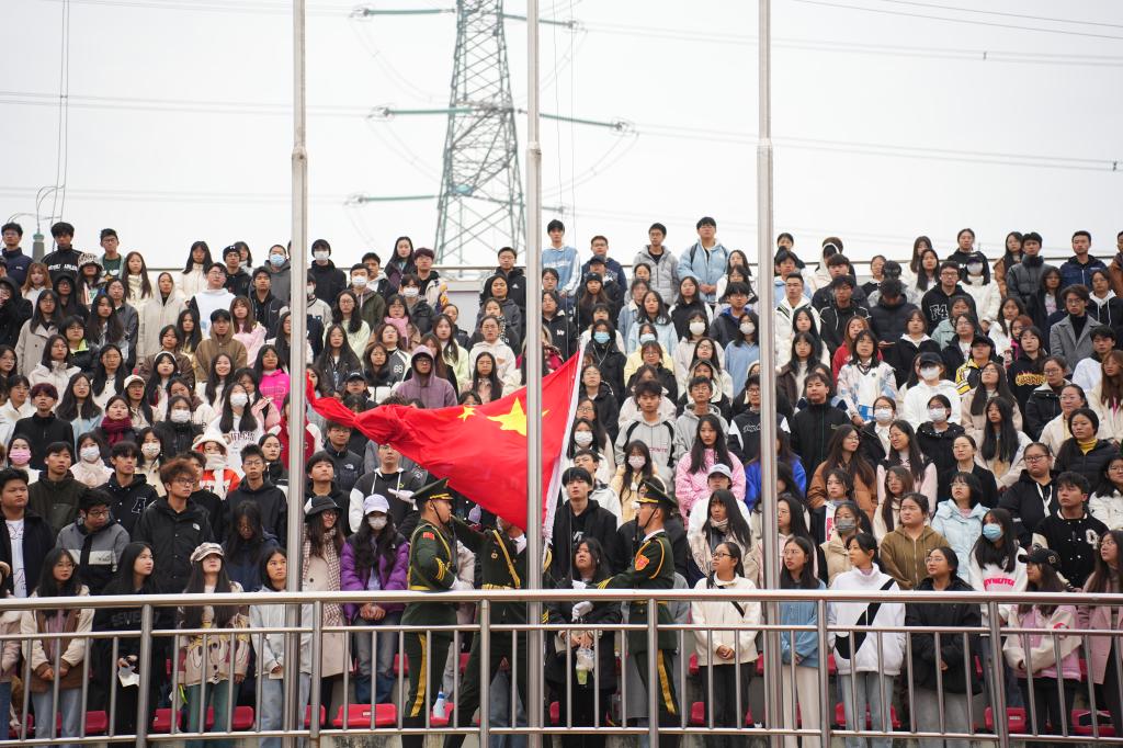 在全场师生的注视下,英姿飒爽的军政教导队护卫着国旗,迈着铿锵的步伐入场。随后,在庄严的国歌声中,鲜艳的五星红旗在奥体中心体育场冉冉升起。