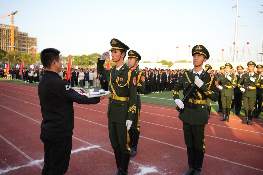 最后,在全场师生的欢呼声中,总裁判长、体育学院院长严财庆接过承载着体育精神的运动会会旗,为我校第二十四届运动会正式画上句号。