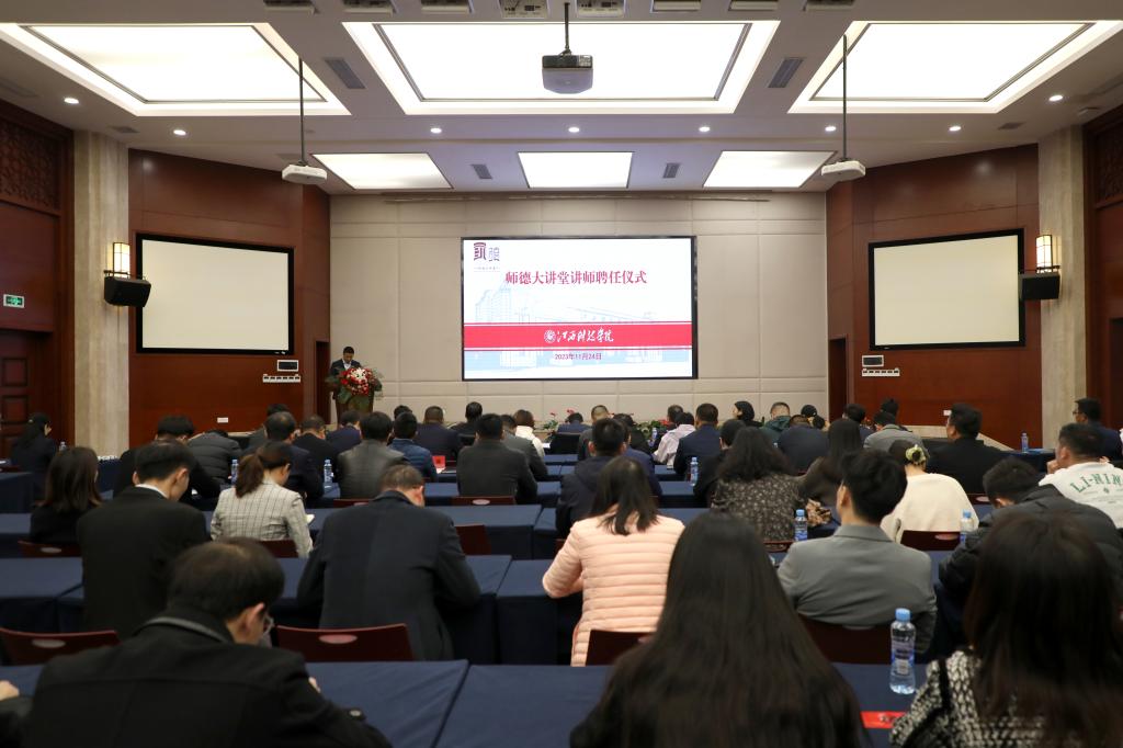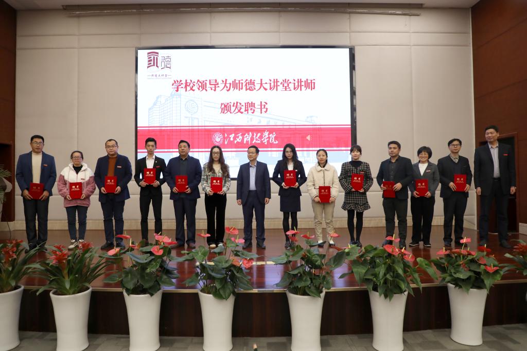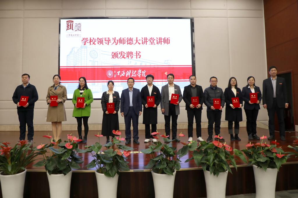夏拥华副书记宣读《关于聘任江西科技学院师德大讲堂讲师的决定》。校领导为师德大讲堂讲师聘书。