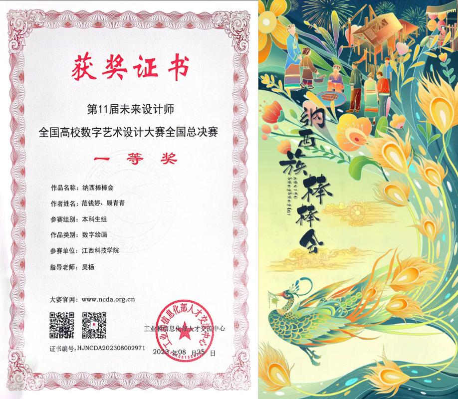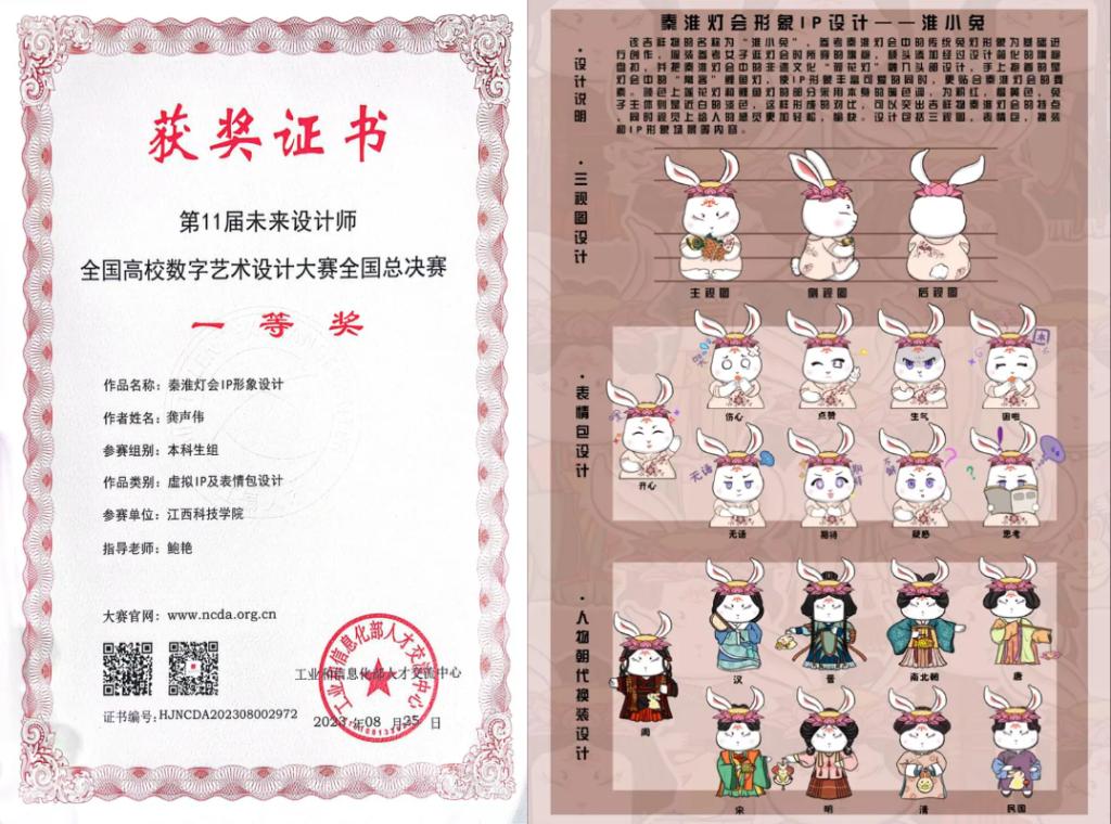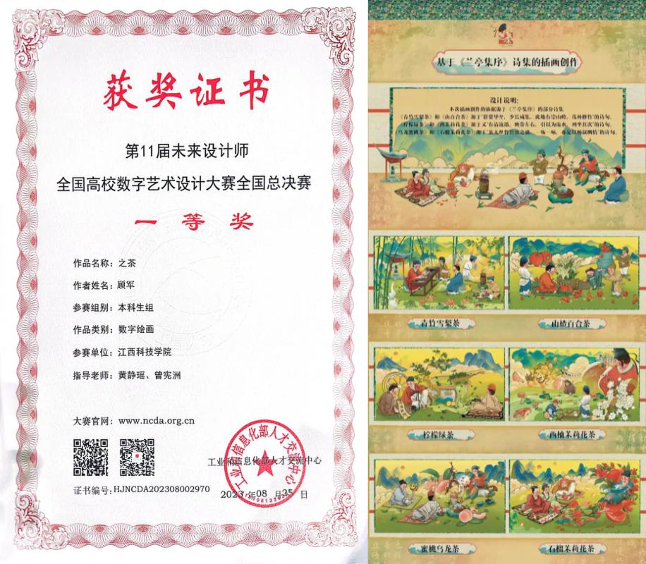 其中,由顾军创作的《之茶》(指导老师:黄静瑶、曾宪洲),龚声伟创作的《秦淮灯会IP形象设计》(指导老师:鲍艳),范钱婷、顾青青创作的《纳西棒棒会》(指导老师:吴杨),蒋赵丽创作的《民俗神话人物视觉延展》(指导老师:袁晶)荣获国家级一等奖。车汶徽创作的《白小豚家族》(指导老师:周姗、胡慧青),严嘉雯创作的《林源古迹-上海广富林遗址互动H5》(指导老师:袁晶),许雅琳创作的《沉月岭》(指导老师:袁晶),俞裕龙、林楷涵、陈恩琪创作的《畲族服饰元素在家居设计中的应用》(指导老师:曹菲菲、陈虹),刘欣然创作的《莫比乌斯》(指导老师:黎嘉婕)荣获国家级二等奖。林海艳创作的《物声》(指导老师:胡慧青、周姗),张佩颖、陈梦雅创作的《“纯本海味”即食海产品包装》(指导老师:周姗、胡慧青),程琳创作的《千岛秘境》(指导老师:邓明慧、高圣斐),潘蕴僖创作的《童心神话》(指导老师:刘玢),方雅洁、徐心蕾、吴亚琼创作的《黑厨》(指导老师:黎嘉婕)荣获国家级三等奖。黄静瑶、曾宪洲、鲍艳、吴杨、袁晶等5位老师荣获全国优秀指导教师,肖雅婷老师荣获全国优秀组织教师。