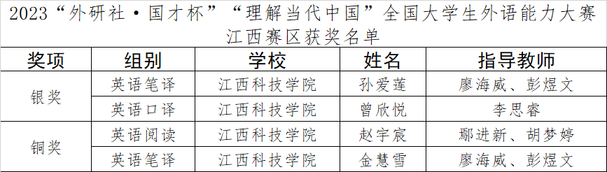 在江西赛区决赛中,我校共派出17名选手参赛,最终荣获7项大奖。外国语学院学子崔羽喆(指导教师:喻明煌、赖雅丰)获英语演讲组特等奖,励媛伊(指导教师:喻明煌、赖雅丰)、郑文馨(指导教师:桂睿阳、江丽萍)分获英语演讲组以及英语写作组二等奖,外国语学院学子孙爱莲(指导教师:廖海威、彭煜文)、曾欣悦(指导教师:李思睿)分获英语笔译组以及英语口译组银奖,外国语学院学子赵宇宸(指导教师:鄢进新、胡梦婷)、金慧雪(指导教师:廖海威、彭煜文)分获英语阅读组以及英语笔译组铜奖。