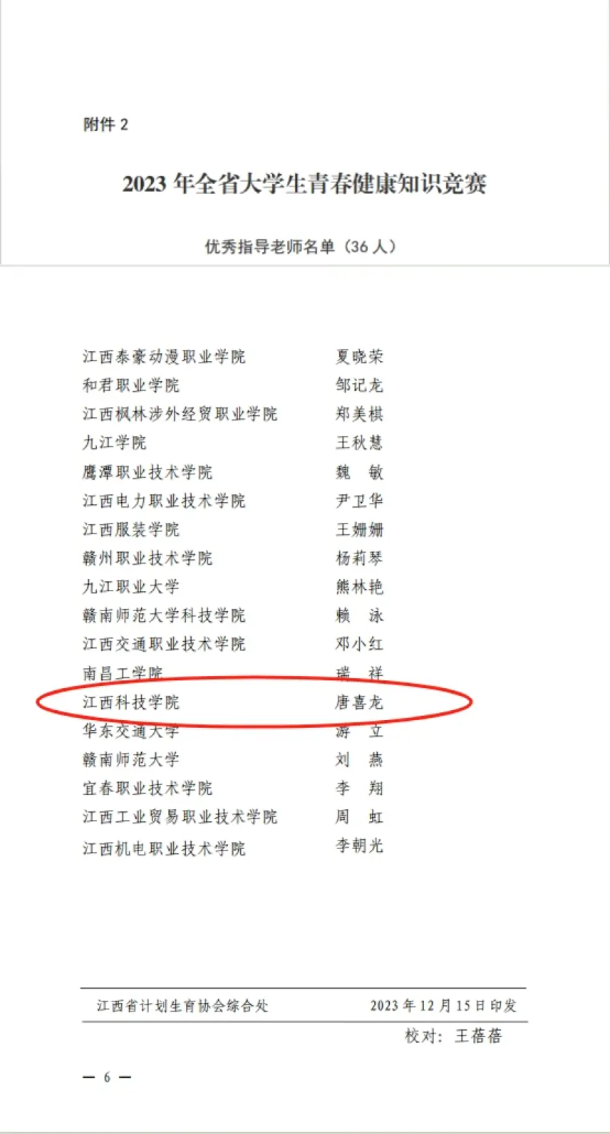 江科网讯(记者 何钰馨)日前,由省卫健委、省教育厅、省计划生育协会联合公布2023年全省大学生青春健康知识竞赛获奖名单,我校荣获最佳网络人气奖,我校学工处唐喜龙荣获优秀指导老师称号。