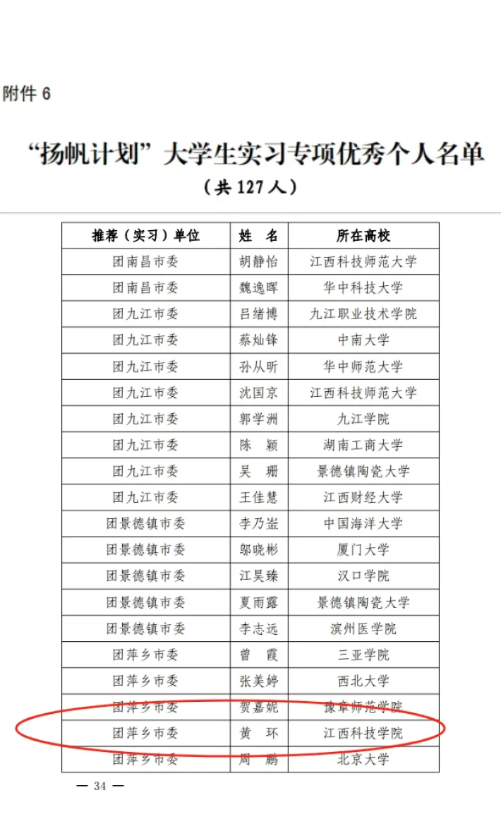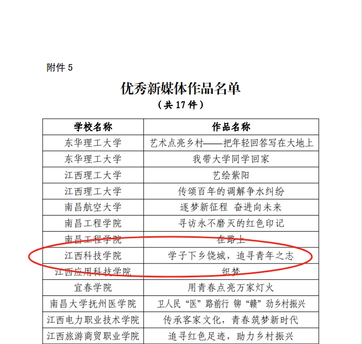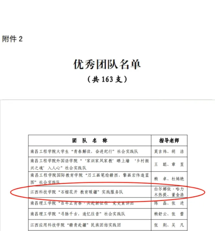 江科网讯(记者 何钰馨)近日,省委宣传部、省文明办、省教育厅、团省委、省残联、省学联联合发文表彰了2023年江西省大中专学生志愿者暑期“三下乡”社会实践活动优秀集体以及个人。我校“石榴花开 教育暖疆”实践服务队(指导老师:白尔娜依·哈力木热提、董金浩)荣获优秀团队称号,人工智能学院团委书记张旭云、外国语学院辅导员李晨园、学子唐卓荣获优秀个人称号,《学子下乡饶城,追寻青年之志》荣获优秀新媒体作品,学子黄环获评“扬帆计划”大学生实习专项优秀个人。