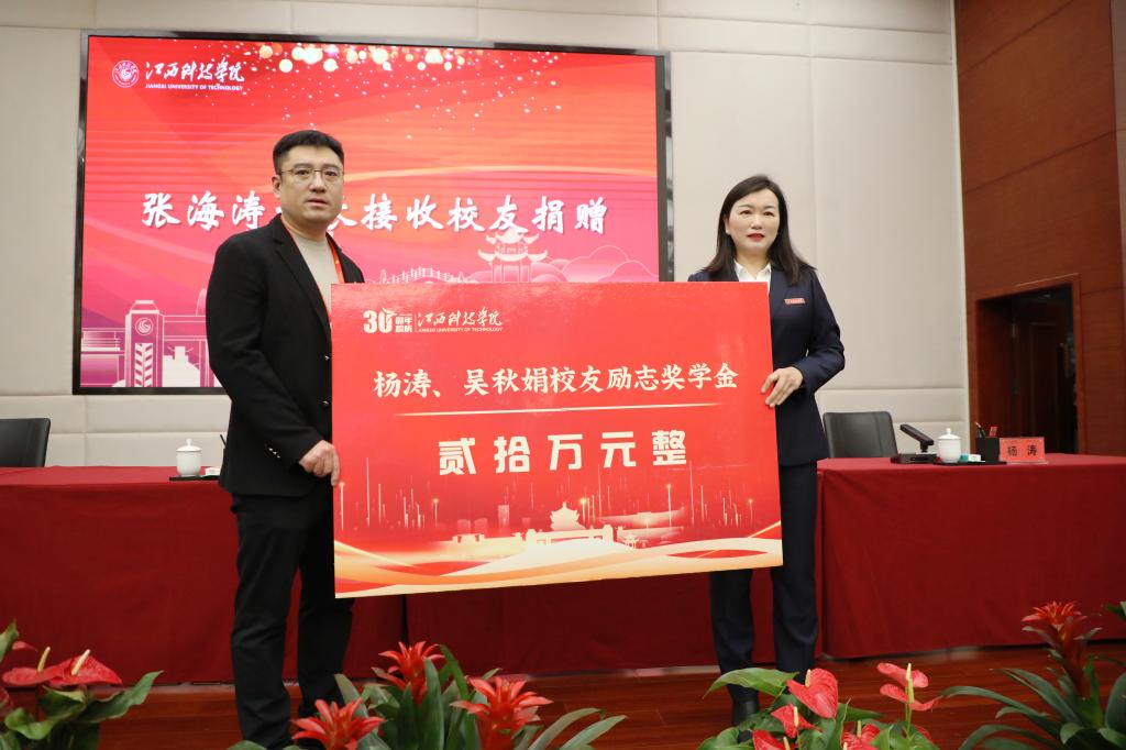 于果主席在致辞中向杨涛校友表示衷心感谢,对校友奖学金设立的重大意义表示高度认可。他表示,学校成立三十年来,始终秉承“以科教兴国为己任,为振兴中华而办学”的宗旨,坚持“一辈子只做教育,教育做一生,一生只做一件事”,传承“自信自强、创业创新”的江科精神,以领先姿态跑在了中国民办教育事业的道路上。近期设立的红利奖优助学爱心基金,江期胜、李萍校友励志奖学金,米拉迪力校友石榴籽民族团结奖学金,以及今天设立的杨涛、吴秋娟校友励志奖学金,都表达了校友们深深的母校情谊,反映了校友们创新创业历程中“永不言败”的江科精神。他强调,“办一所大学”的梦想已经实现,“办一所好大学”的梦想需要所有江科人、所有校友的力量。希望在校同学们好好学习,向优秀校友们学习,坚守、践行好江科精神,一同为实现江科梦不懈努力。