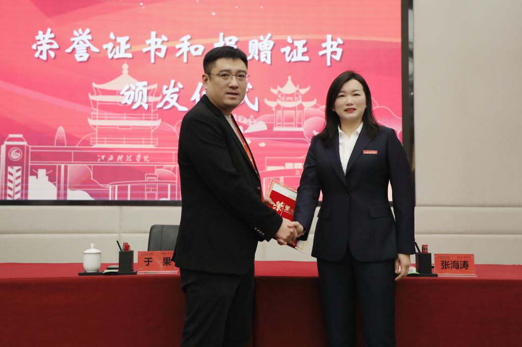 张海涛校长代表学校接收校友捐赠,并为校友颁发荣誉证书和捐赠证书。
