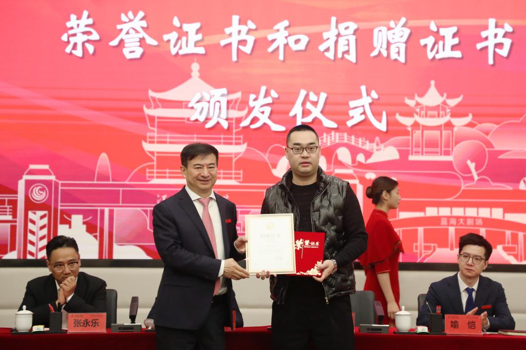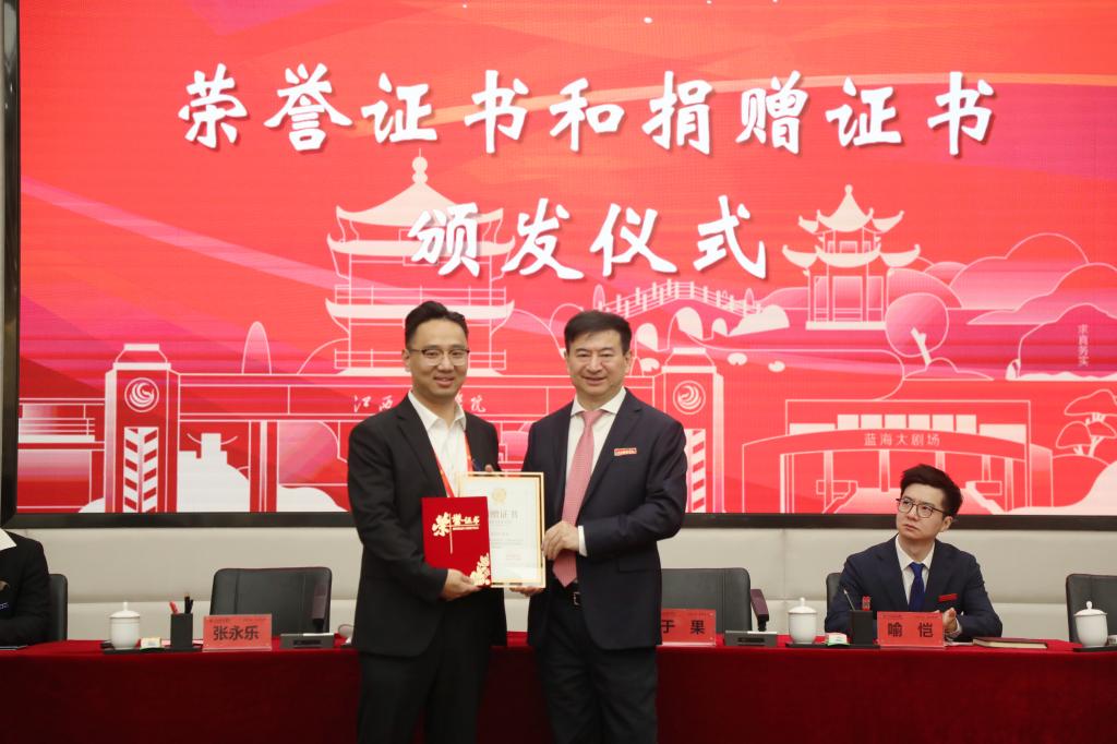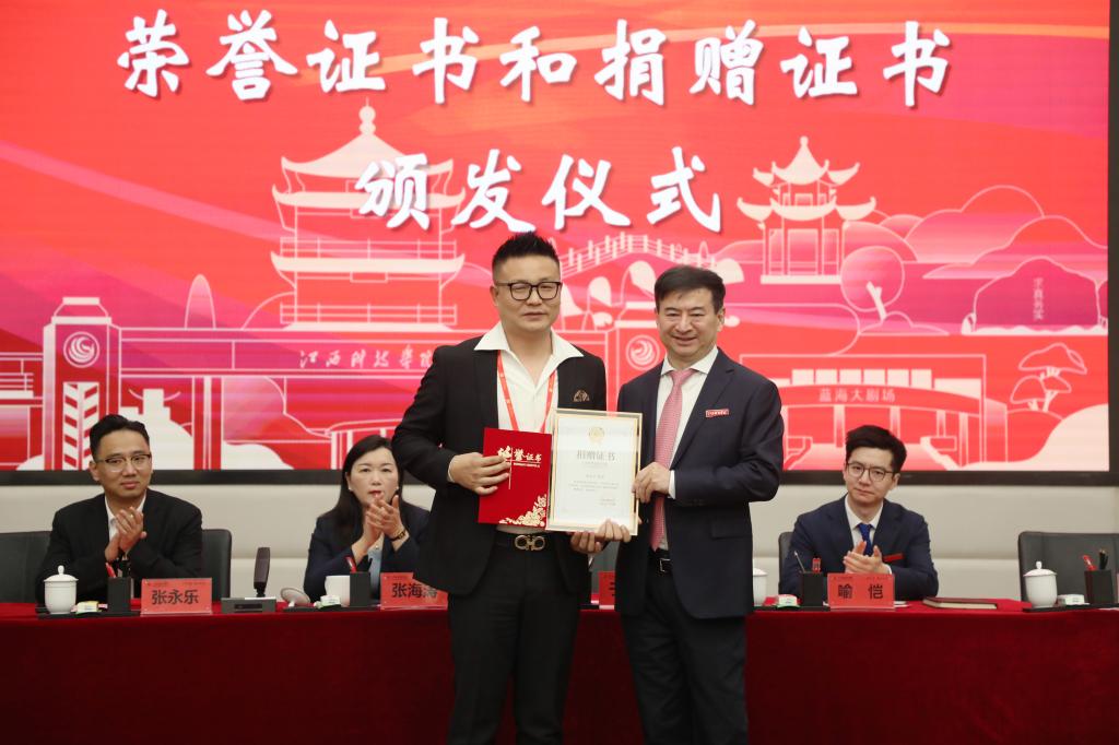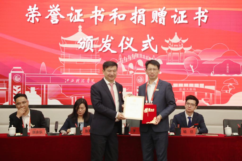 在全场热烈的掌声中,于果主席、喻恺董事长、张海涛校长为校友会代表和校友们颁发荣誉证书和捐赠证书,校长张海涛代表学校接收捐赠。