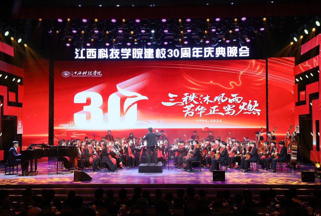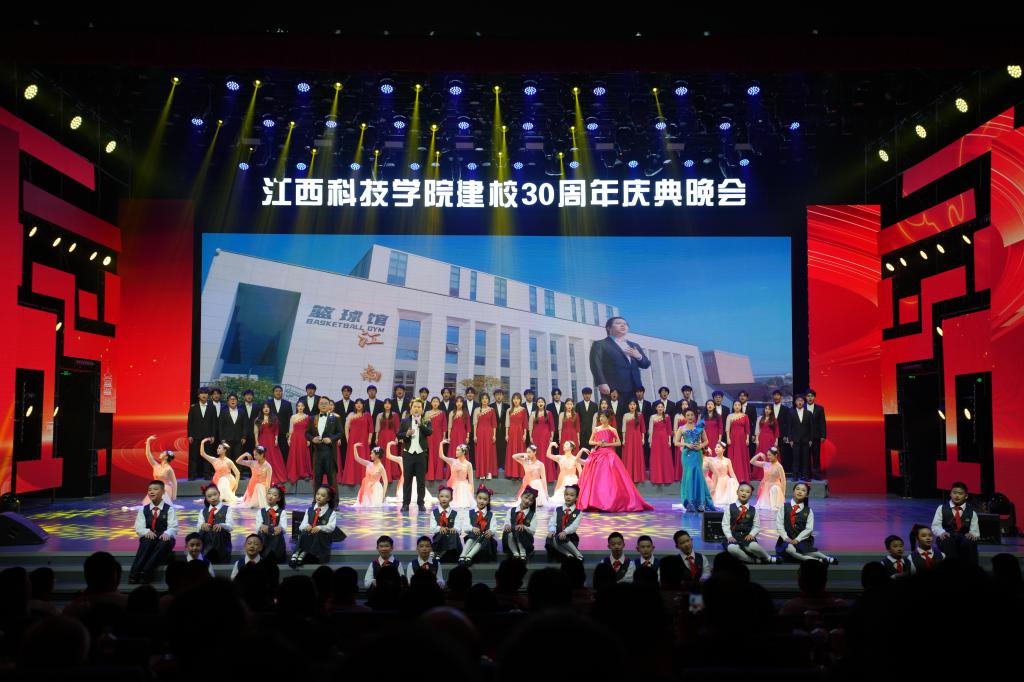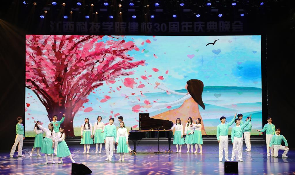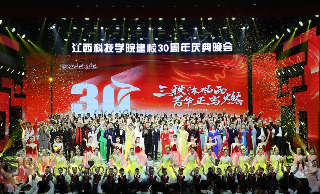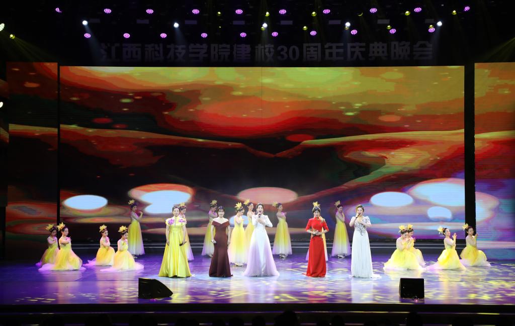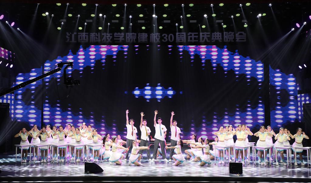 瑶湖之畔弦歌起,风华正茂奏凯章。晚会主体分为“蓝天憧憬阔”“芳华青春潮”“执梦耀未来”三个篇章,通过歌舞表演、时装走秀、器乐演奏、诗歌朗诵等精彩纷呈的节目以及视觉化呈现,传递出对祖国的热爱与期盼,表达对母校深厚而炽热的情感。“一路走来,爱是无言表白;追梦脚步,汇成赣江澎湃……”尾声歌舞节目——建校30周年主题歌《一起向未来》唱了薪火相传的最强音,开启砥砺奋进的新征程。