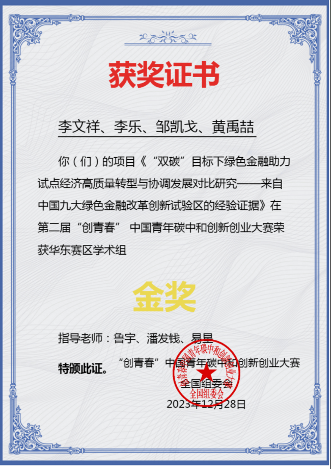 江科网讯 近日,第二届“创青春”中国青年碳中和创新创业大赛华东赛区决赛在华东理工大学落下帷幕,由我校财经学院鲁宇、潘发钱老师以及协同创新中心易星老师指导,财经学院李文祥同学负责的项目《“双碳”目标下绿色金融助力试点经济高质量转型与协调发展对比研究——来自中国九大绿色金融改革创新试验区的经验证据》荣获学术组金奖,并将代表华东赛区参加全国总决赛。
