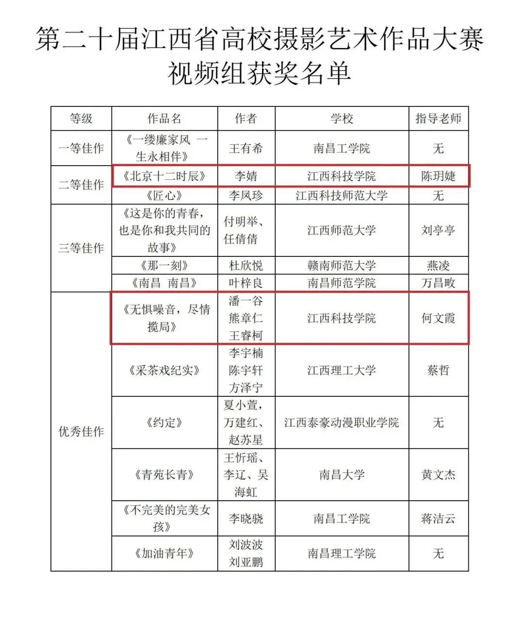 江科网讯 近日,由江西省教育厅艺术教育委员会、江西省摄影家协会、江西省高等学校摄影学会主办的第二十届省高校摄影艺术作品大赛评选结果公布揭晓。由我校文化与传媒学院学子李婧创作的《北京十二时辰》(指导老师:陈玥婕)获评视频组“二等佳作”,潘一谷、熊章仁、王睿柯共同创作的《无惧噪音,尽情揽局》(指导老师:何文霞)获评视频组“优秀佳作”。