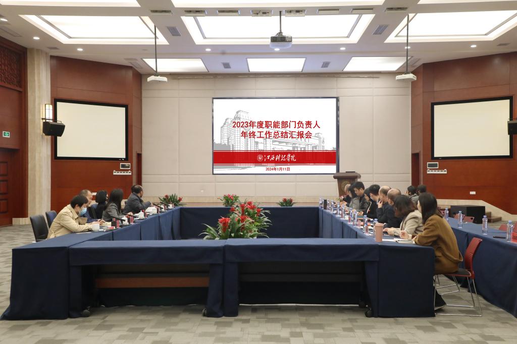 江科网讯(记者 刘莹)1月11日上午,校长张海涛在行政南楼第一会议室主持召开2023年度职能部门负责人年终工作总结汇报会。全体在家校领导出席会议。宣传部、团委、人事处、校企合作处、教务处、学工处、科研处、招就处、保卫处负责人参会。