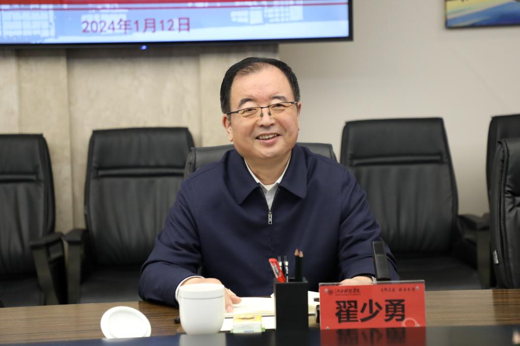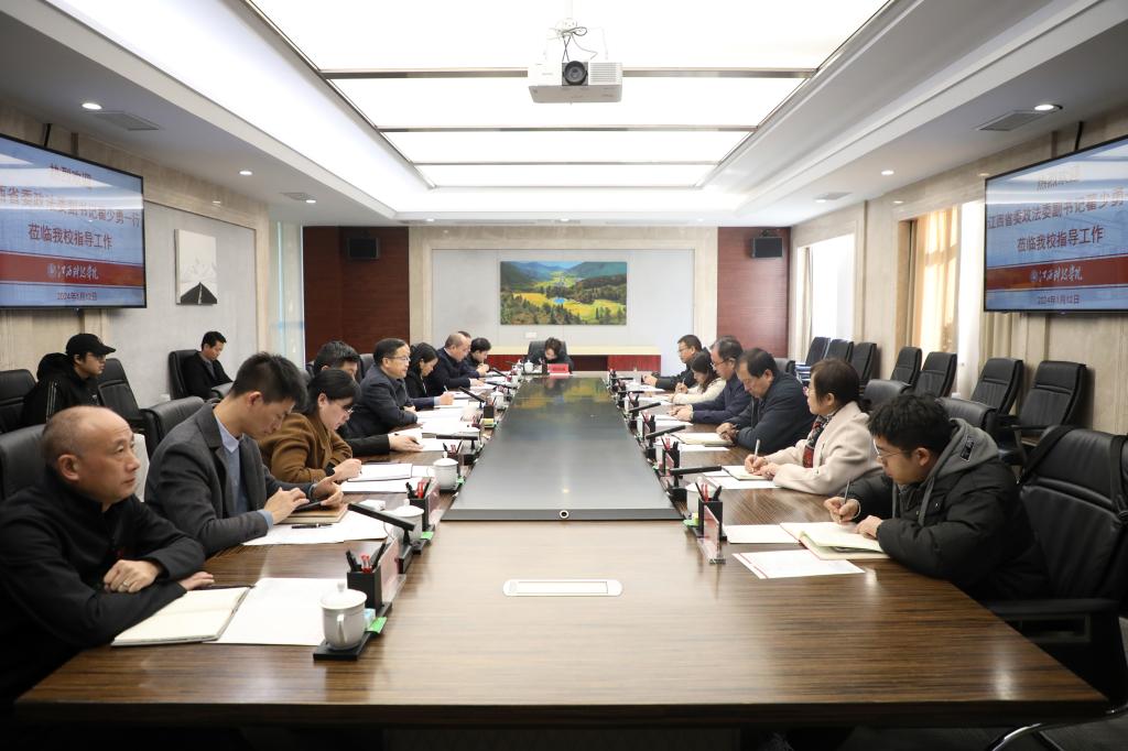 江科网讯(记者 何强江)1月12日上午,江西省委政法委副书记翟少勇一行来校走访调研。学校在行政南楼第三会议室召开“用中华优秀传统文化滋润心灵 有形有感有效铸牢中华民族共同体意识”座谈会。校党委书记、督导专员邓弘,校党委副书记、副校长闵桂林,学校有关职能部门负责人及学生代表参加座谈会。