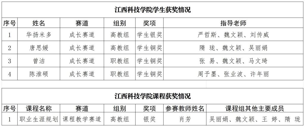 江科网讯(招就处)日前,省教育厅公布了首届江西省大学生职业规划大赛成绩,我校参赛选手在成长赛道、课程教学赛道喜获银奖2项、铜奖3项,学校获优秀组织奖。