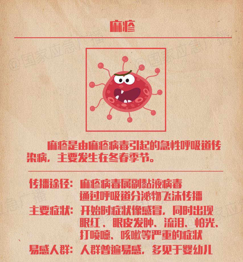 ②麻疹:麻疹是由麻疹病毒引起的急性呼吸道传染病,每年3-5月是麻疹的季节性发病高峰。