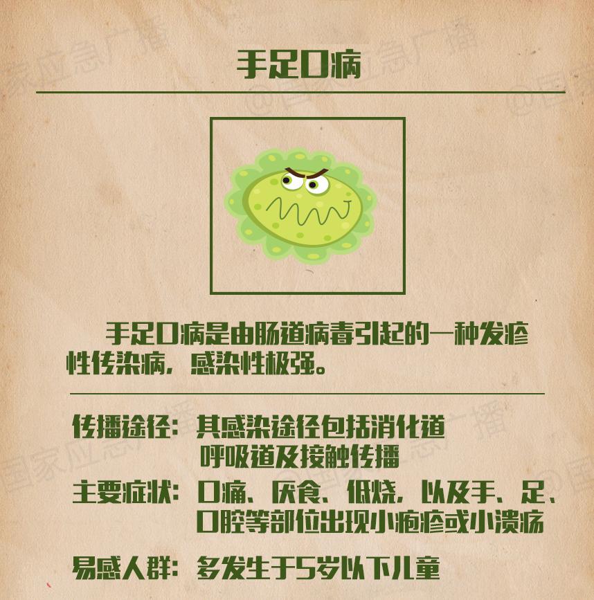 ③手足口病:手足口病是由肠道病毒引起的一种发疹性传染病,多发于5岁以下儿童。多数患儿一周左右自愈,少数患儿可能出现心肌炎、肺水肿、脑膜炎等并发症,甚至导致死亡。
