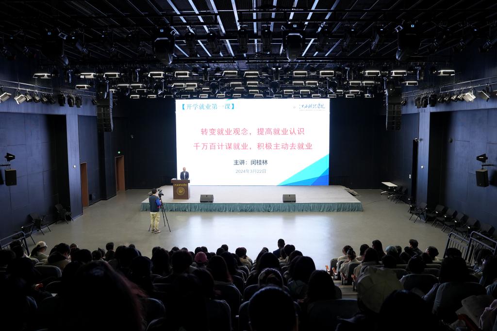 课堂上,闵桂林副校长以《转变就业观念,提高就业认识千万百计谋就业,积极主动去就业》为主题,从就业形势新动态、就业观念新变化、千方百计谋就业、积极主动去就业等四个方面展开,以丰富的经验和深刻的见解,结合身边案例和数据分析,深入浅出引导同学们明确正确的成才观、职业观、就业观,鼓励大家紧跟就业新形势,抓住发展新机遇,把个人的理想追求融入党和国家的事业之中,为党和人民贡献青春力量。