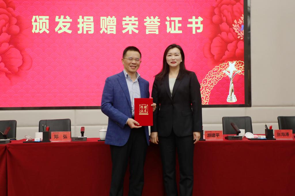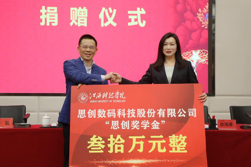 游建平董事长代表思创公司向学校捐赠30万元奖学金,张海涛校长为思创公司颁发捐赠证书。
