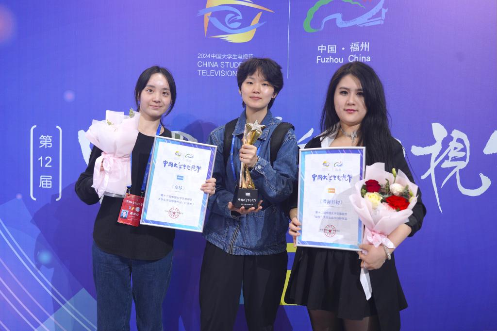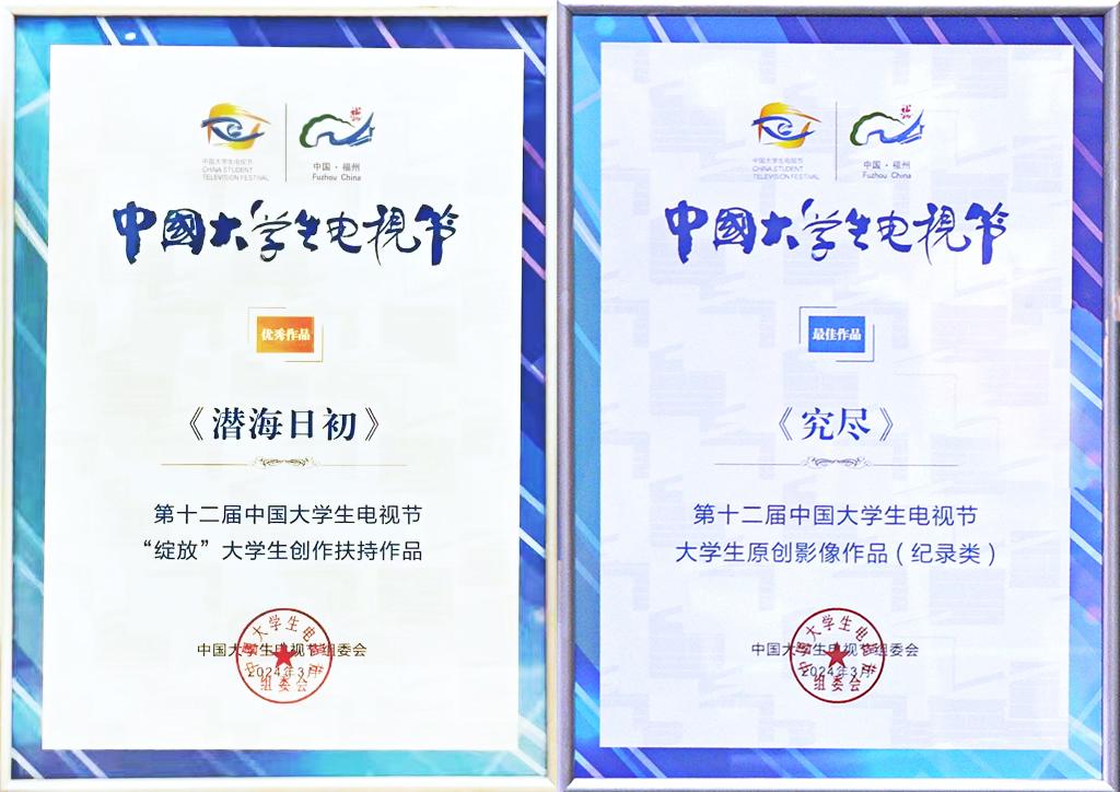江科网讯(通讯员 朱凌)近日,由中国文学艺术界联合会、中国艺术家协会、中国传媒大学共同主办的第十二届中国大学生电视节在福州举行颁奖盛典。我校文化与传媒学院21级影视摄影与制作专业学生陈可佳、陈丽雯等创作完成的《究尽》(指导教师:贾翔羽)荣获“纪录类最佳作品”,并参加线下展映交流活动;朱凌老师创作的原创长片电影《潜海日初》荣获大学生电视节优秀扶持项目。