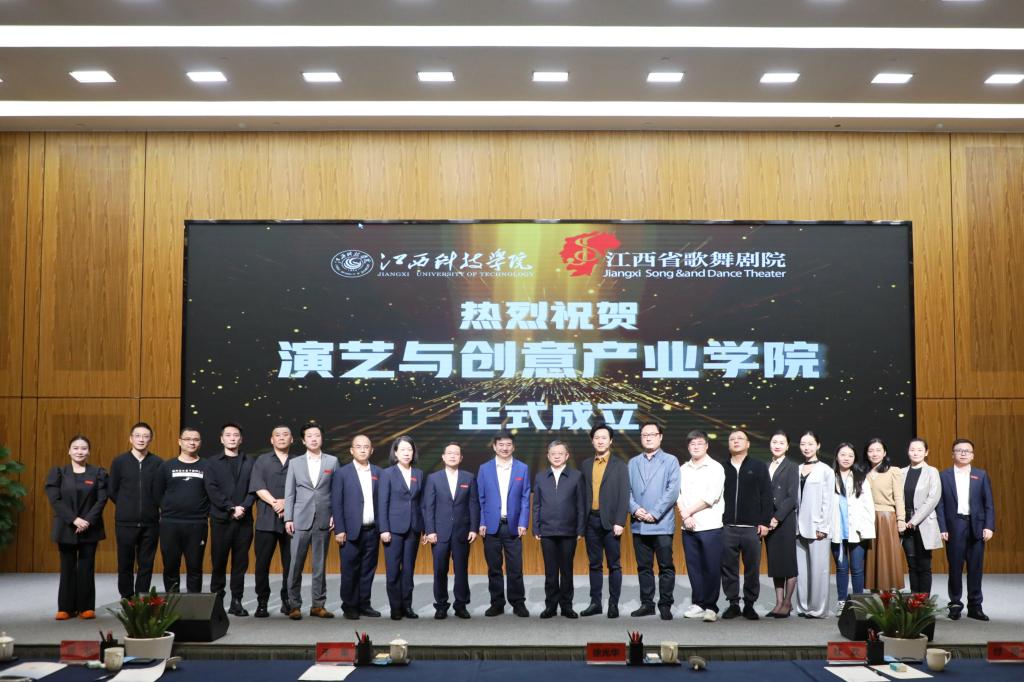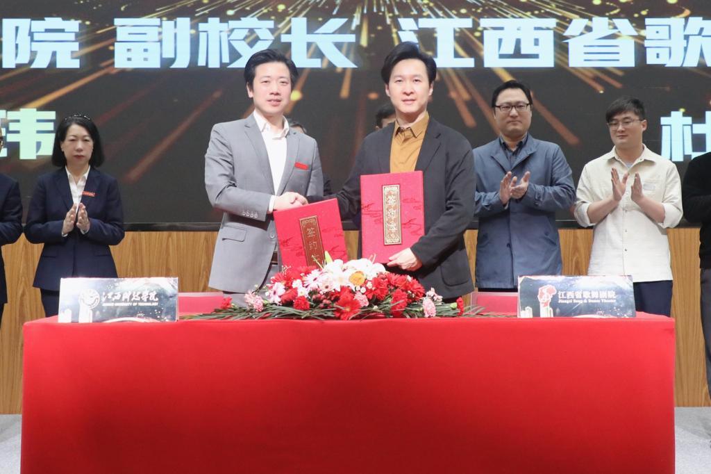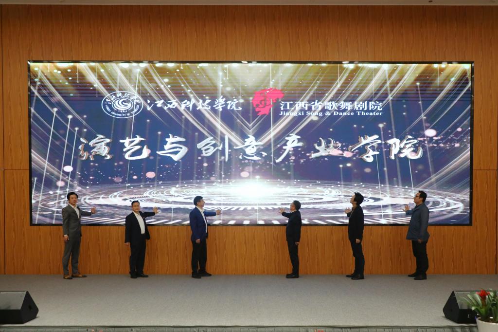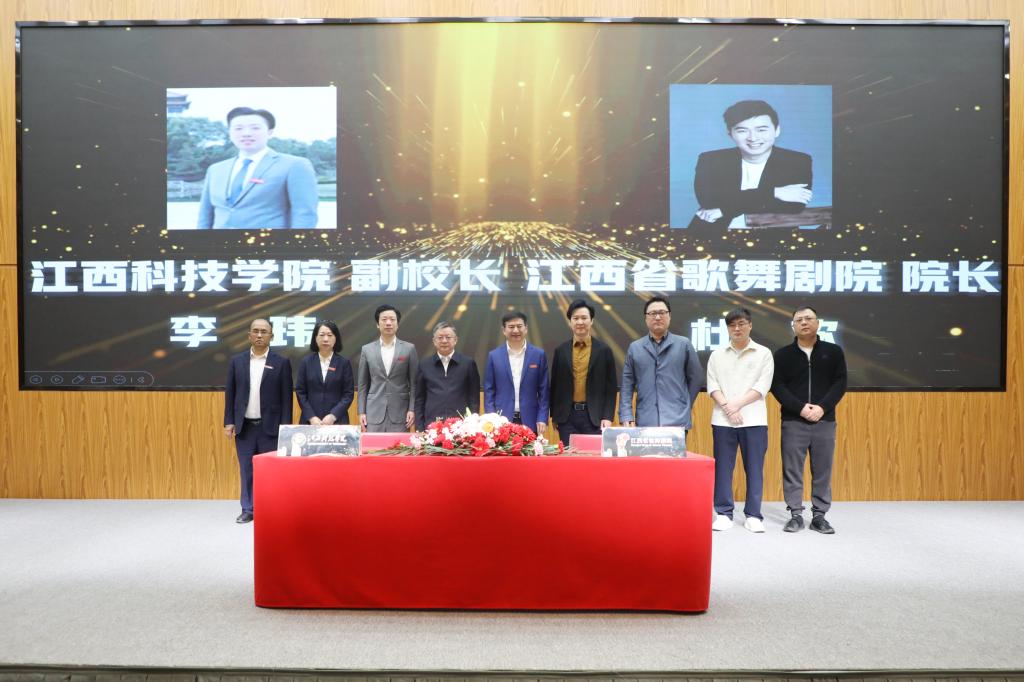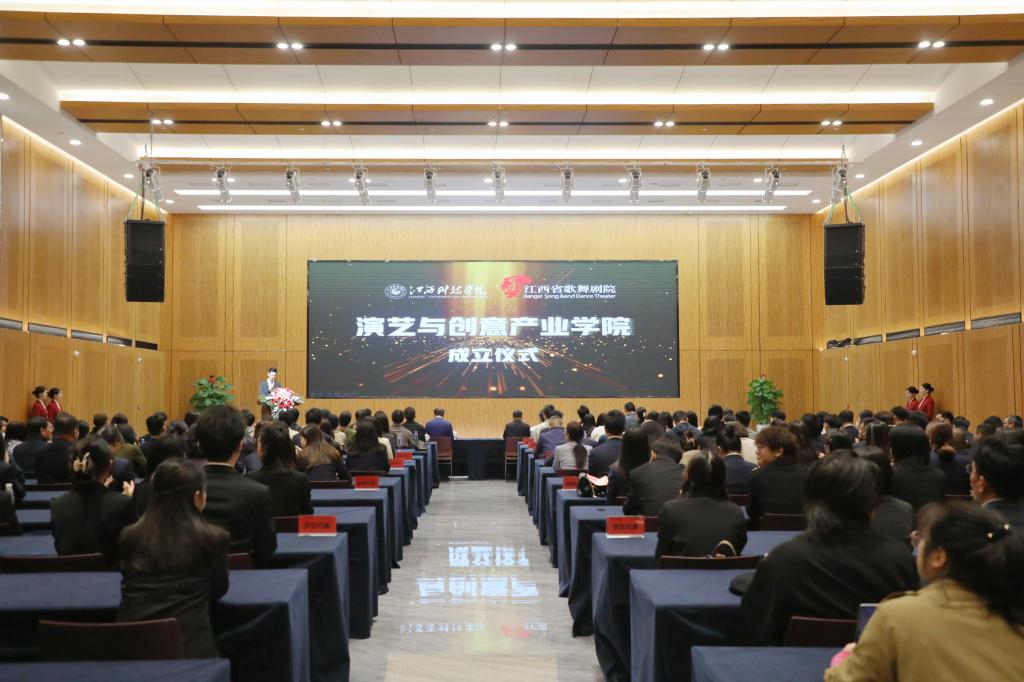 于果在致辞指出,与江西省歌舞剧院合作建设演艺与创意产业学院,既是我校贯彻落实党的文艺方针,深刻践行习近平文化思想的实际行动;也是服务我省“文化强省”战略,推动文艺事业高质量发展的使命担当;更是践行国家“产教融合”方针,为社会培养高质量应用型人才的砥砺探索,具有深刻的现实意义、广泛的市场前景和重要的社会价值。就办好演艺与创意产业学院,他提出三点期盼。一是赓续血脉,立足赣鄱,创演精品。要赓续苏区文艺的血脉基因,俯身扎根赣鄱红土,坚定立场、不忘初心、积极探索、敢作敢为,精诚合作、强强联合,创作并演绎出一批“传得开、留得下、高水平、有情怀”的文艺精品佳作,为我省的“文化强省”战略和党的文艺事业,贡献出“江科+省歌”的智慧与合力。二是校企联动,产教互嵌,打造样板。要扎实推动校企双方的优势联通与资源互动,积极探索出一套“出得了精品也育得好人才,能贴近舞台也看得见讲台”的产教融合育人模式,致力成为校企合作新样板,为相关行业、产业和专业提供“江科+省歌”的经验与参照。三是弘艺传道,培育英才,服务社会。要把握“文艺为人民”的大道,借助平台、机制和模式将讲台与舞台整合联通,让教师站到行业一线,请名家进到校园中来,把学生带到岗位前沿,引导学生拓眼界、得真知、练本领、养德行、磨心性,为党和社会培育和造就更多德艺双馨的文艺人才,做出“江科+省歌”的德艺与贡献。