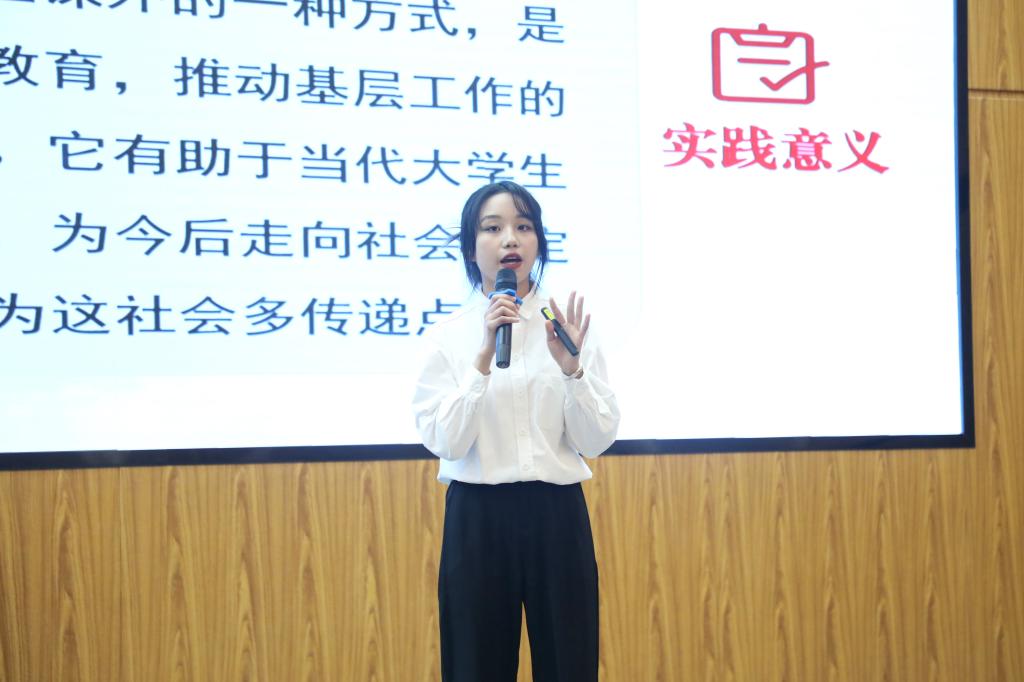 会上,校团委书记马孙亮从“强化组织引领,确保安全有序”“立足能力范畴,主动担当作为”“汇聚实践成果,提升育人实效”三个方面汇报2024年寒假“返家乡”社会实践基本情况。医学院22本护理3班曾晓洋、音乐舞蹈学院23本播音3班刘京洋、医学院22专护理2班陈国山、财经学院23本财管2班罗宇等四位同学先后上台,结合各自社会实践情况,谈服务、谈感受、谈收获。大家纷纷表示,这次实践活动让他们在基层的火热实践中经风雨、见世面、壮筋骨、长才干,对家乡的建设发展有了更全面的了解和更深入的认识。