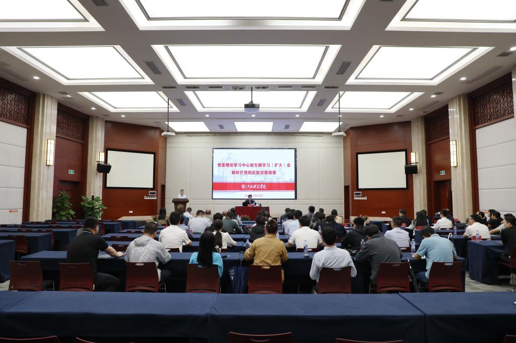 江科网讯(记者 刘莹)为深入学习贯彻习近平总书记关于加强和改进民族工作的重要思想、关于宗教工作的重要论述,进一步做好民族宗教工作,4月16日下午,校党委理论学习中心组在行政南楼第一会议室召开专题学习(扩大)会议。会议特邀省委统战部民族宗教处处长、一级调研员唐风春作《新时代党的民族宗教政策》专题辅导报告。校党委书记邓弘,在家校党委委员,校统一战线工作领导小组成员单位负责人,各二级党委(党总支)书记、统战委员、专职副书记、学工秘书,党外人士代表、思政教师代表共同到场聆听学习。会议由邓弘书记主持。