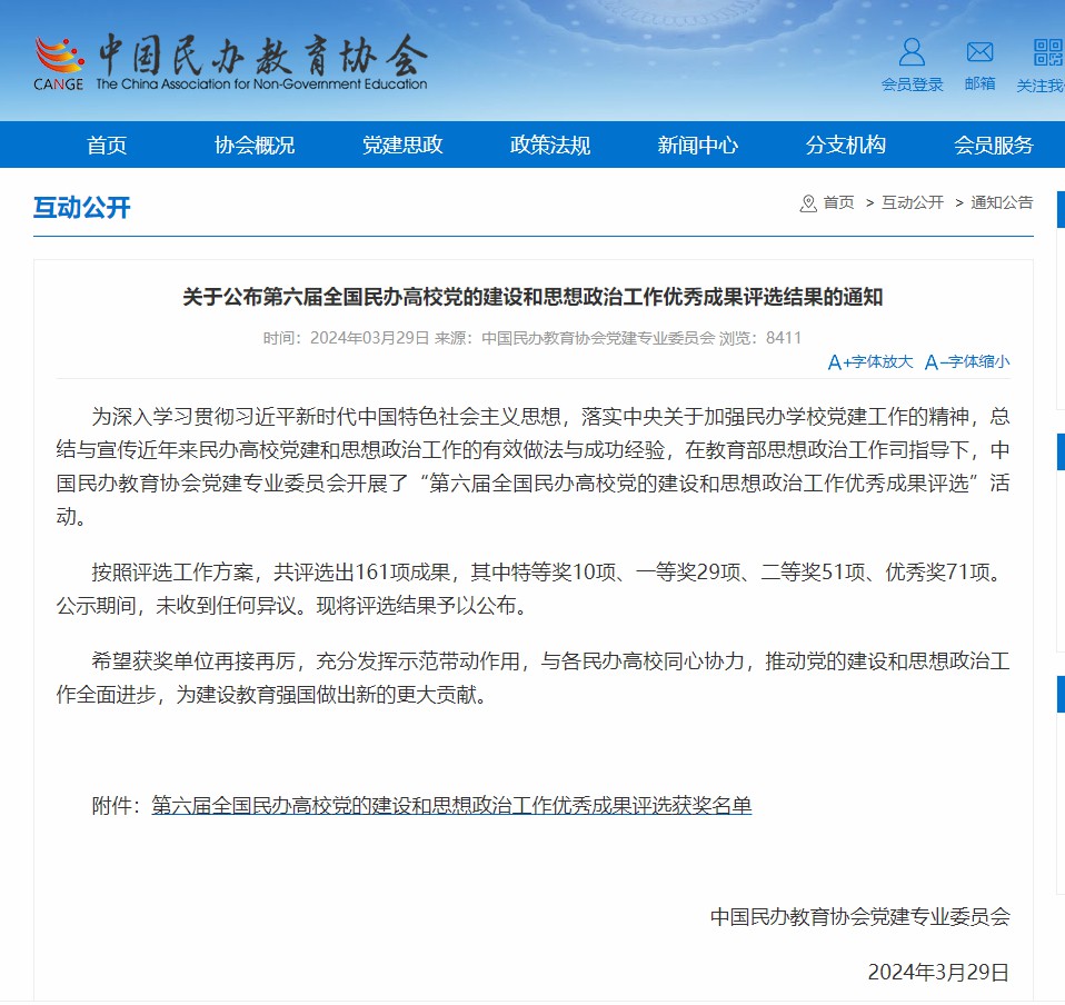 本次评选旨在深入学习贯彻习近平新时代中国特色社会主义思想和党的二十大精神,落实中央关于加强民办学校党建工作的精神,总结与宣传近年来民办高校党建和思想政治工作的有效做法与成功经验,共评选出161项成果,其中一等奖29项。