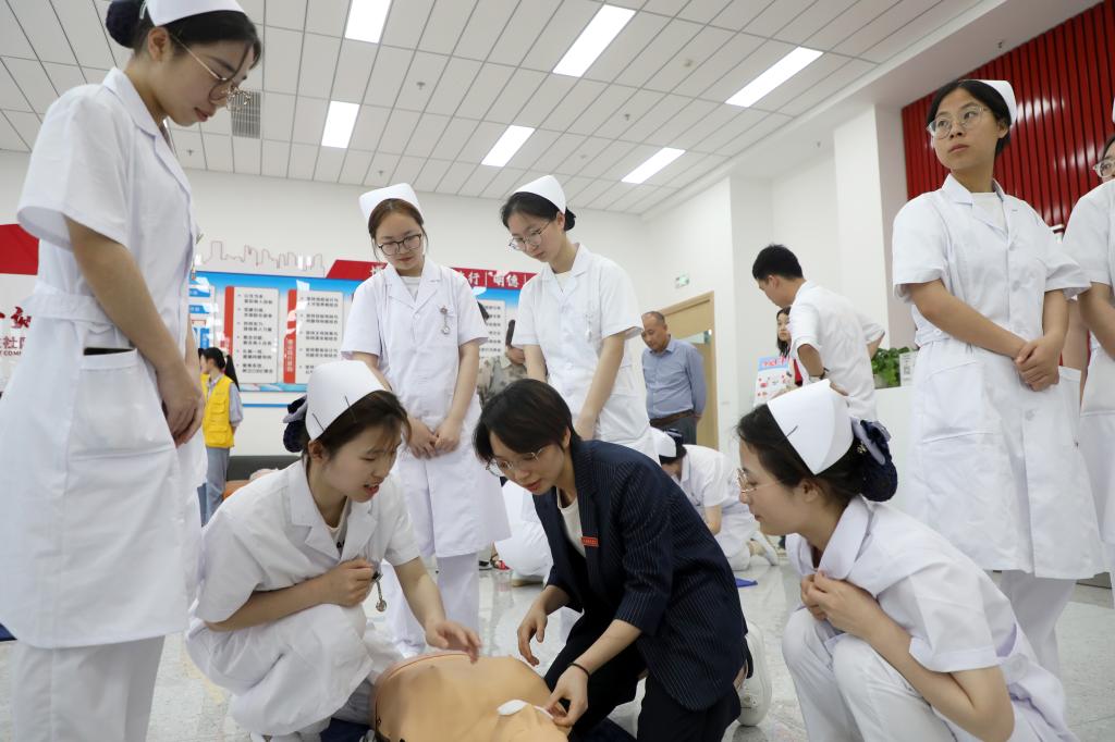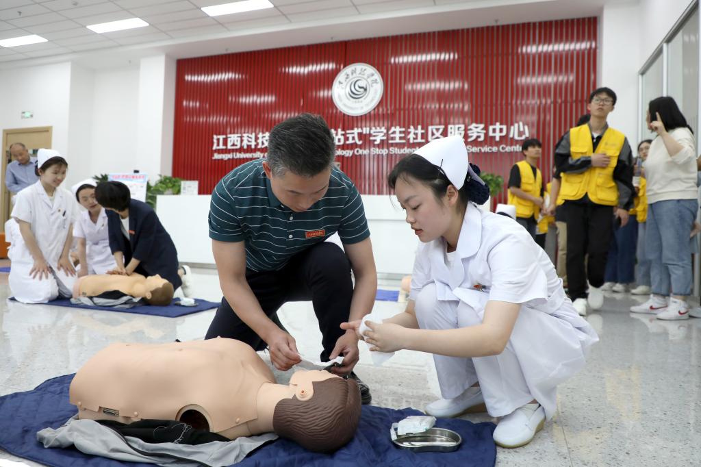 启动仪式结束后,讲师团向参加活动的师生普及心肺复苏、海姆立克法等急救知识,并向大家详细讲述心肺复苏的具体操作过程。为了使大家更好地掌握心肺复苏和人工呼吸的技术要点和正确操作手法,讲师团特地携带模拟人进行现场演示,邀请师生进行操作演练,指导大家在发生紧急情况时进行心肺复苏、人工呼吸、胸外按压等急救措施,并重点强调救助过程中的注意事项,尤其对如何第一时间采取正确、有效的应急措施进行指导,争取最大限度在医生和救护人员到来之前协助挽救生命。