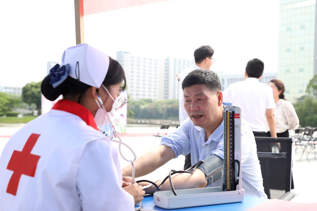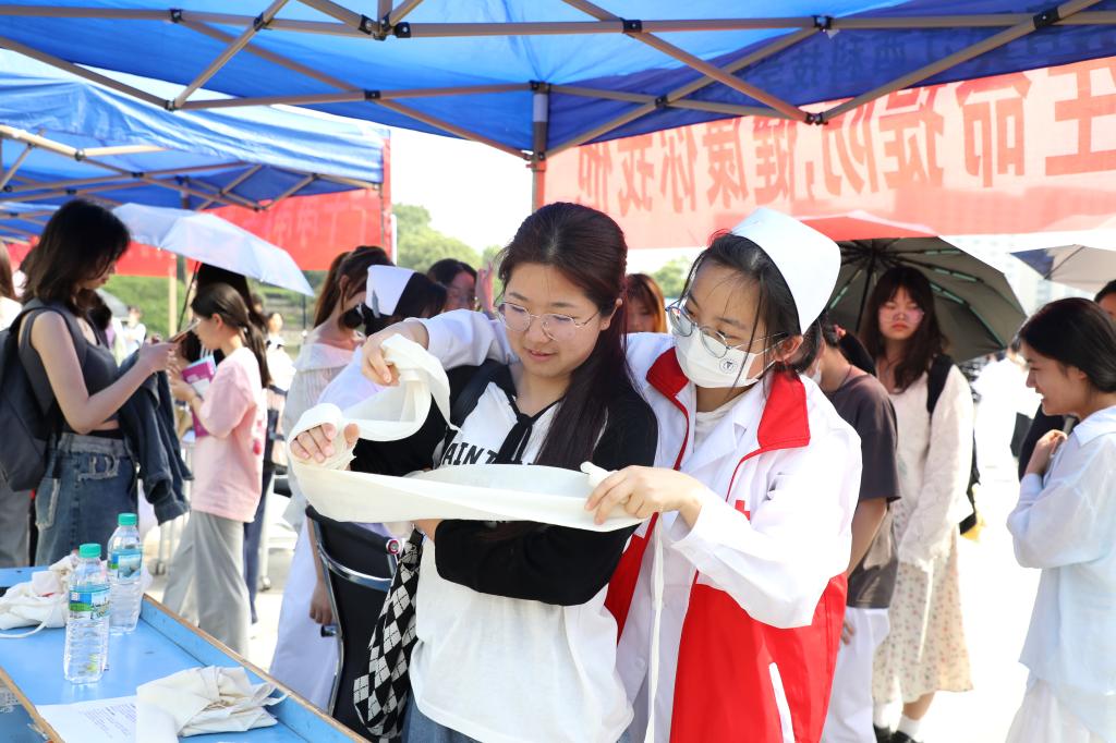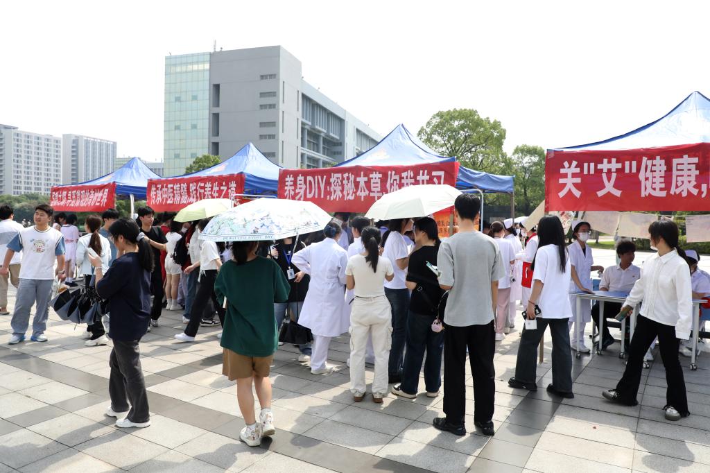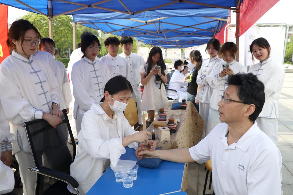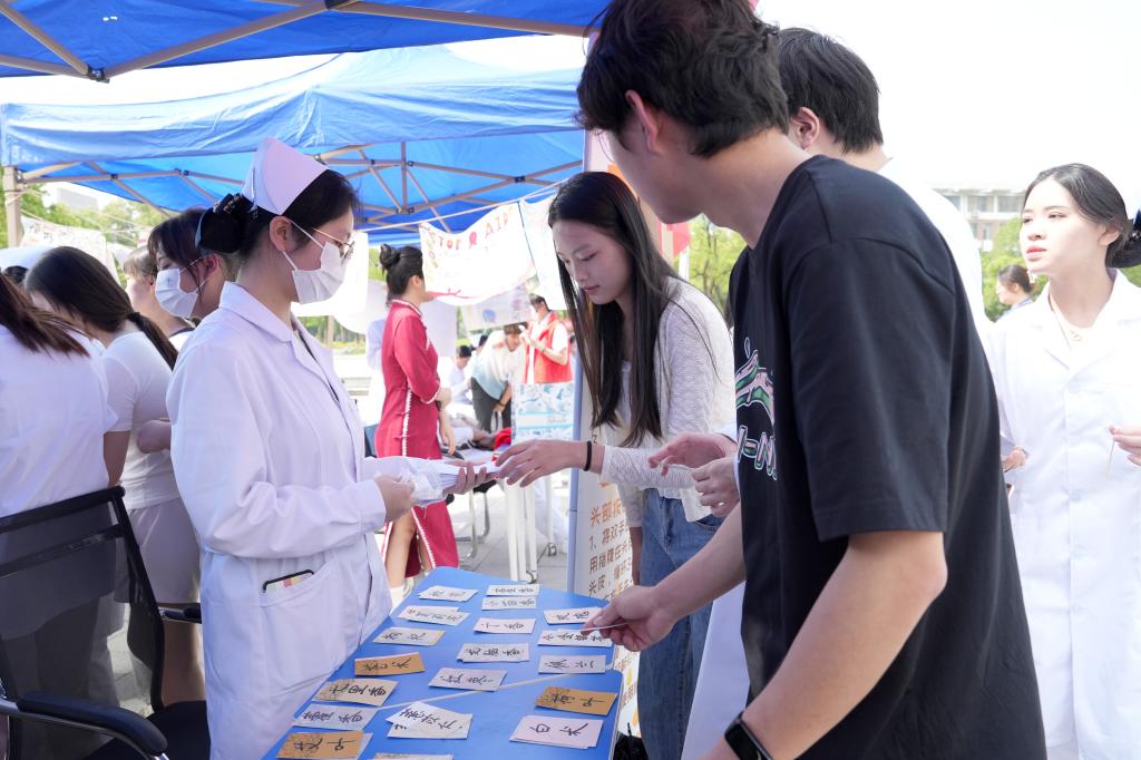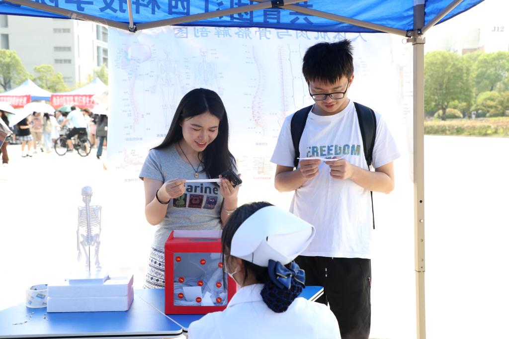 测量血糖、血压,学习海姆利克急救法、心肺复苏法、七步洗手法,体验艾灸、按摩、刮痧,参与医学知识问答、人体骨骼知识普及、手工DIY抓药房制作小香囊、显微镜体验等游戏互动,聆听医学知识宣讲,观看手抄报展……丰富的项目、热情的服务,让活动现场的师生频频点赞。