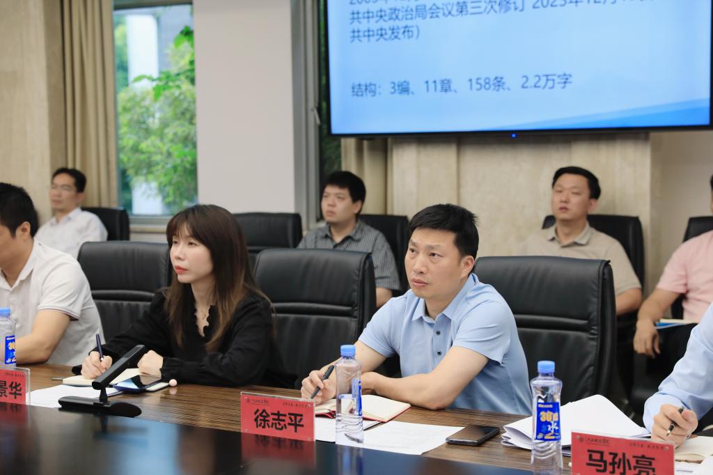 邓弘结合自身学习体会、工作经验、研究成果和学校工作实际,认真梳理了习近平总书记关于党纪学习教育的重要指示精神,从历史与现实维度回顾了党的纪律发展历史,从政治和全局高度阐释了《条例》修订的重要意义,以深学细研为要求分析了《条例》修订重点内容与突出特点,并带领大家逐字逐句学习《条例》总则内容。