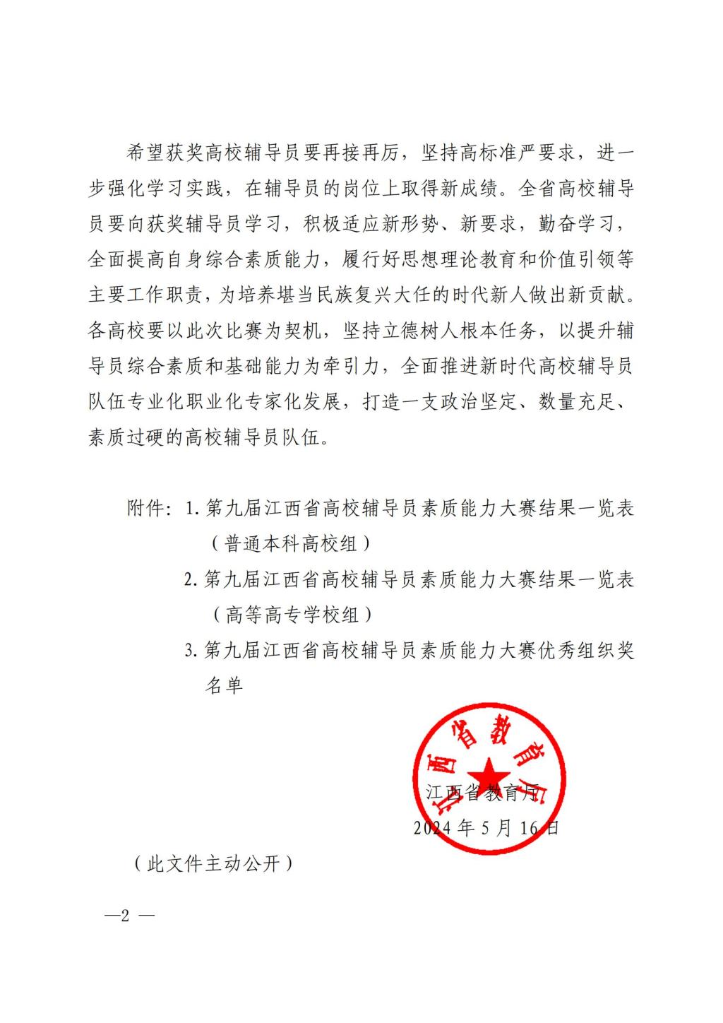 据悉,江西省高校辅导员素质能力大赛由江西省教育厅主办,是全省高校辅导员最高赛事,每两年举办一次。本届比赛吸引了全省本科高校共计80名选手参赛,最终产生普通本科高校组一等奖8名、二等12名、三等奖16名。