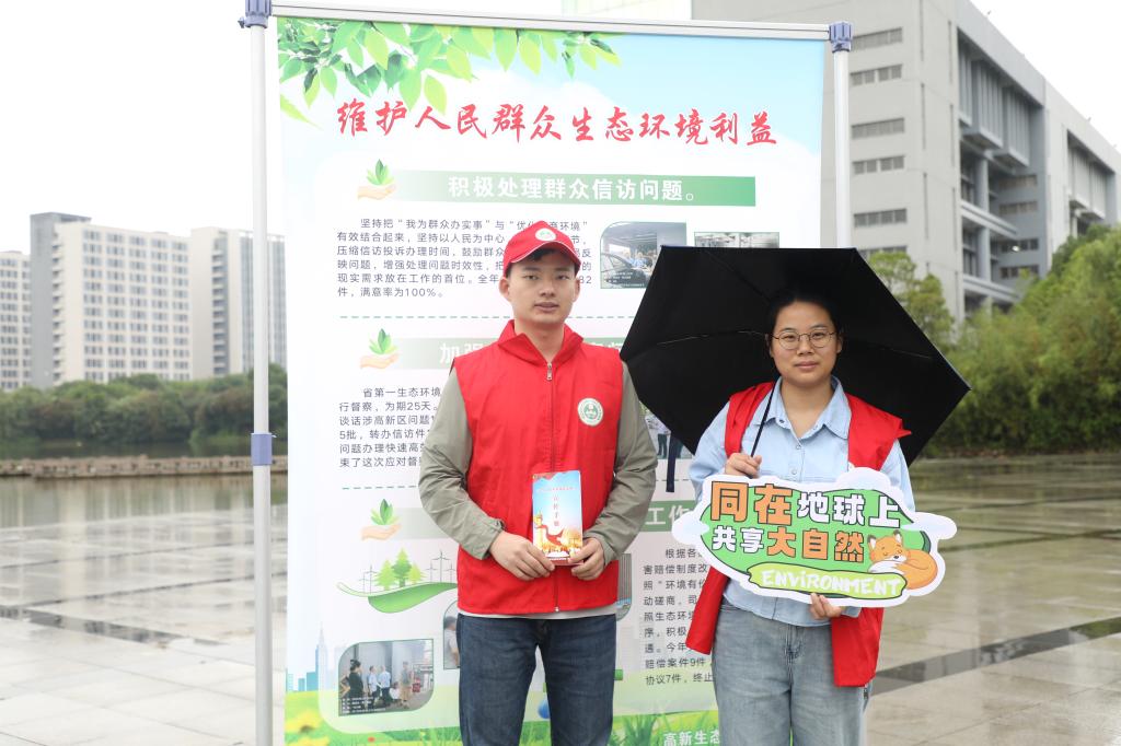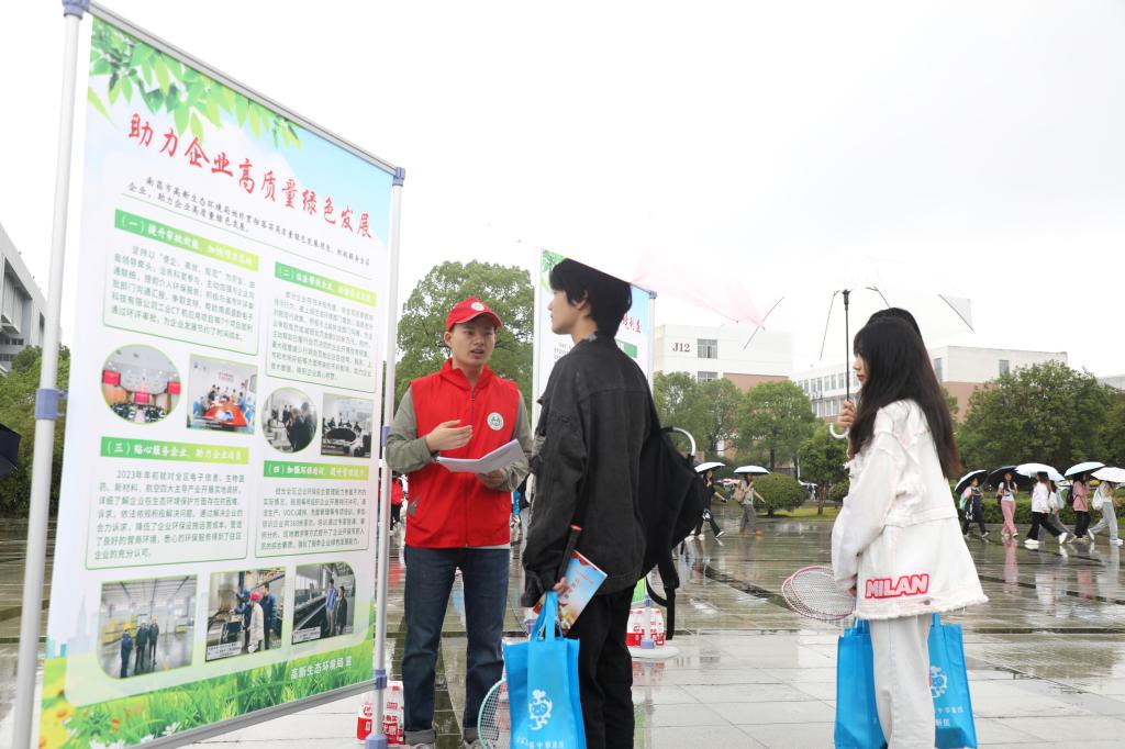 天空虽下着雨,但挡不住同学们参与活动的热情。“生活垃圾应该按有害垃圾、易腐垃圾和可回收物进行分类……”“处置家庭不再使用药物的最好方法是送到正规回收点统一回收,进行无害化处理,减少对生态环境产生危害……”“我们每个人都有保护声环境的义务,同时享受参与和监督噪声污染防治的权利……”活动现场,志愿者们向同学们发放《生活中的危险废物有哪些》宣传单、《中华人民共和国噪声污染防治法》和《中华人民共和国民法典》宣传手册,从不同角度讲解我国当前面临的生态环境问题、生态文明建设的重要性以及青年学生在环保事业中的责任和担当。