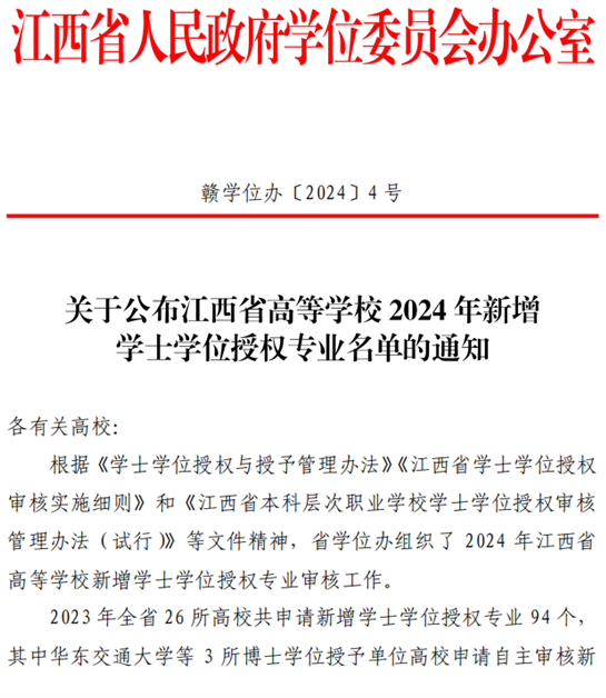江科网讯(通讯员 秦琛)近日,江西省人民政府学位委员会办公室下发了《关于公布江西省高等学校2024年新增学士学位授权专业名单的通知》(赣学位办〔2024〕4号),我校跨境电子商务、虚拟现实技术和智能建造三个专业新增为学士学位授予专业,获得学士学位授予权。