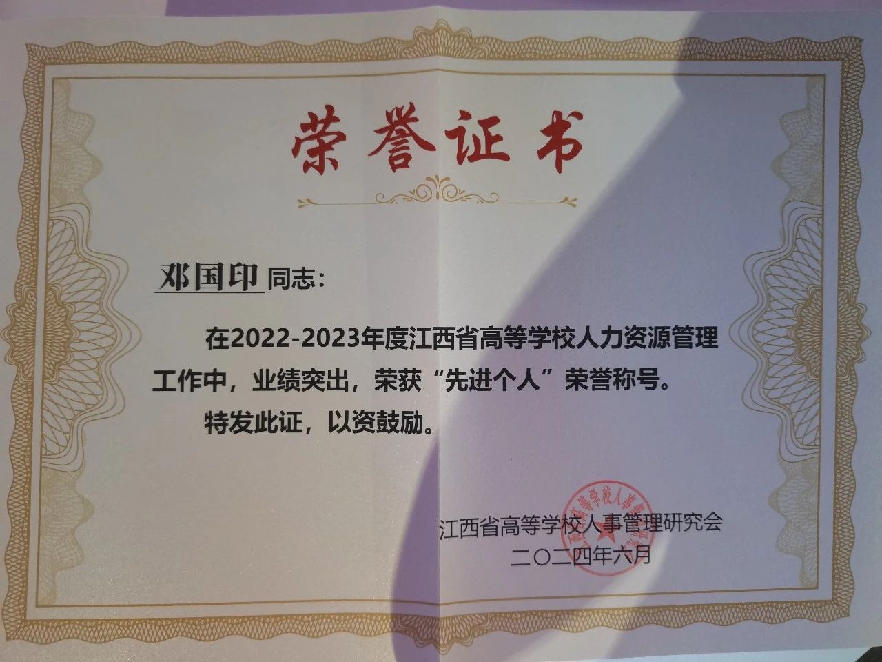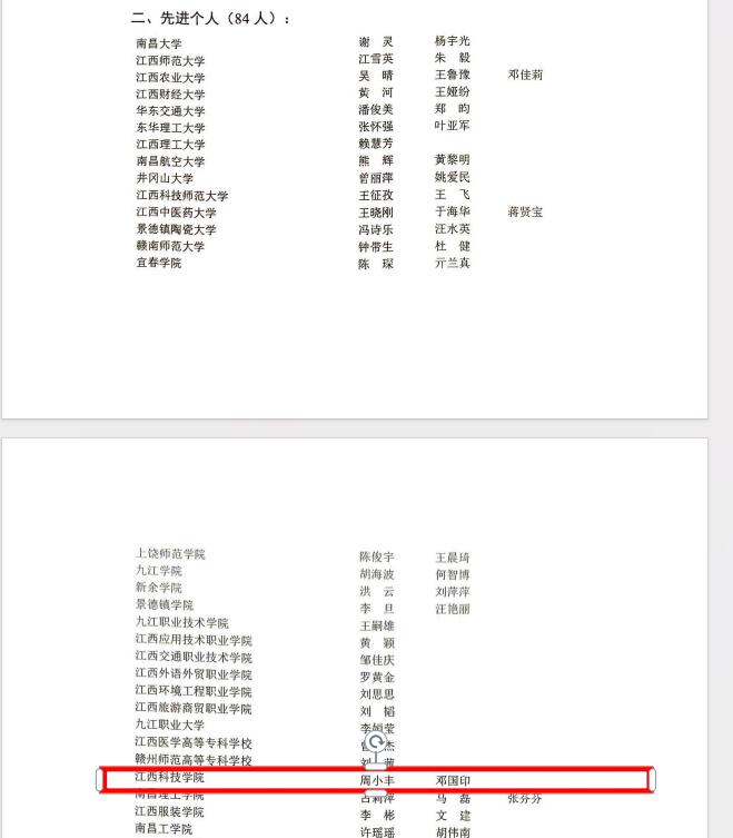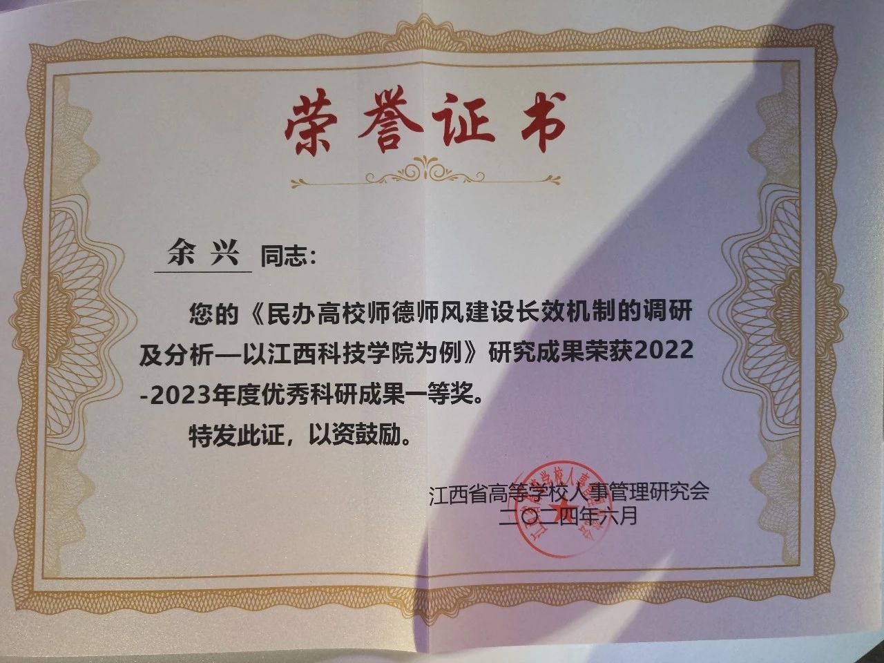 此外,周小丰与人事处邓国印荣获2022-2023年度“全省高等学校人才人事工作先进个人”荣誉称号,论文《民办高校师德师风建设长效机制的调研及分析—以江西科技学院为例》荣获“全省高校人事管理研究会优秀科研成果奖”一等奖。