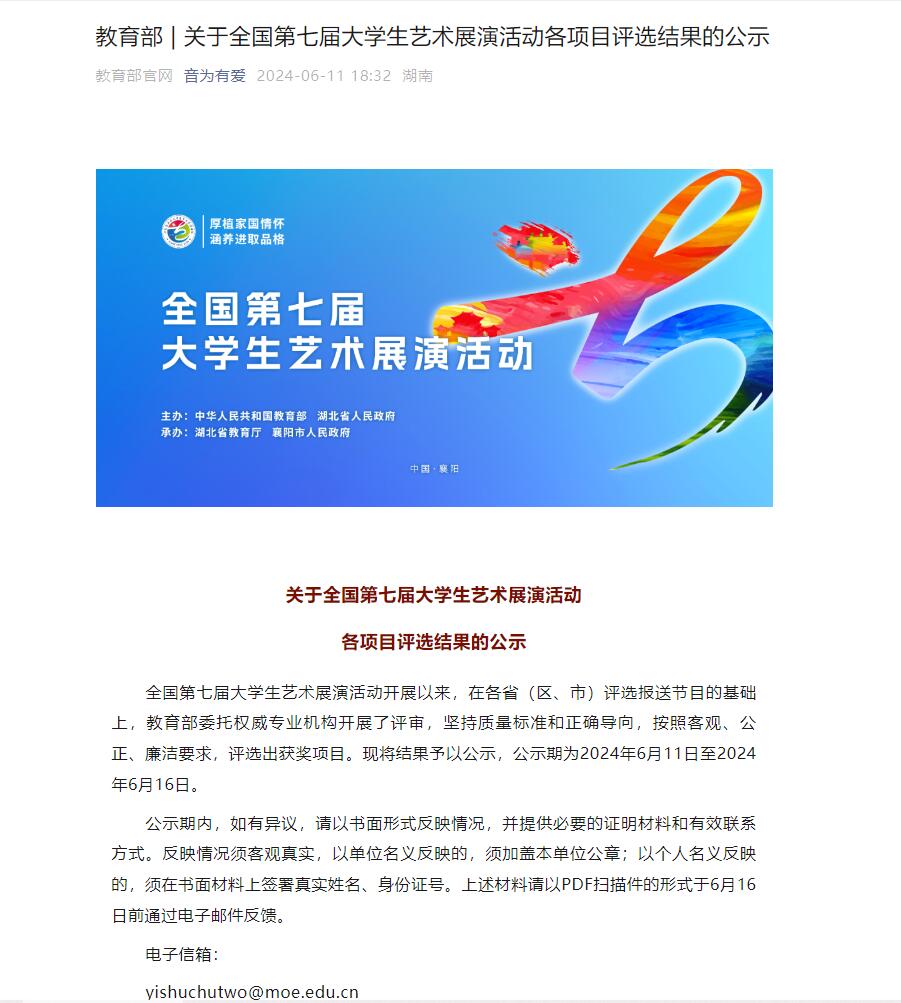 江科网讯(通讯员 龙朝明)近日,教育部官网公示了全国第七届大学生艺术展演活动各项目评选结果,我校音乐舞蹈学院龙朝明、鲁明耀两位老师撰写的美育改革创新案例《“以唱为中心”的高校合唱美育探索与实践》在全国第七届大学生艺术展演活动获得三等奖(该案例同时在2023年江西省第十一届大学生艺术展演活动中荣获美育改革创新优秀案例一等奖)。这是我校首次在全国大学生艺术展演活动决赛中获得奖项,也是我校推进“五育并举”,实施高校美育改革的重要成果之一。