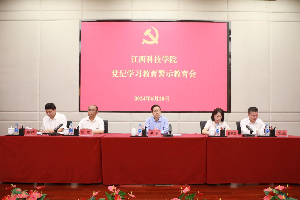 江科网讯(记者 刘莹 杨泳慧 实习记者 杨光)6月28日上午,学校在行政南楼第一会议室召开党纪学习教育警示教育会,深入学习习近平总书记关于全面加强党的纪律建设的重要论述,贯彻落实全省领导干部警示教育会主要精神。党委书记邓弘,党委委员、副校长林素君、陈辉、周冰冰,党委副书记、纪委书记夏拥华等校领导出席,会议由党委组织部部长谢振林主持。
