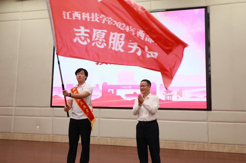 邓弘书记为志愿者代表授旗,对成功入选“西部计划”的志愿者表示祝贺,对同学们积极响应党和国家的号召,到西部建功立业的坚定选择表示赞赏。他勉励同学们要胸怀理想、坚定信念,始终做初心的践行者,牢记初心使命,始终保持对人民群众的深厚感情,始终铭记青年志愿者的服务宗旨,弘扬志愿精神,在思想政治上高标准,坚持认真负责、爱岗敬业、脚踏实地的工作作风;要勤奋学习、砥砺奋进,始终做时代的追梦者,把“读万卷书”与“行万里路”结合起来,做到知行合一,在实践中不断提升自己,锐意进取,不断提升自己的专业能力和综合素质,为当地的发展贡献更多的智慧和力量;要自觉担当、扎根基层,始终做人民的守护者,立足岗位、主动作为、勇挑重担,大力弘扬志愿精神,磨砺推动改革发展、助力乡村振兴、做好群众工作的能力,积极与当地人民群众合作,共同推动当地发展,让青春在不懈奋斗中绽放绚丽之花。最后,他希望同学们在西部地区和地方乡村的工作中,收获满满的成就和宝贵的经验,在为中国式现代化挺膺担当中展现青春作为、彰显青春风采、贡献青春力量。