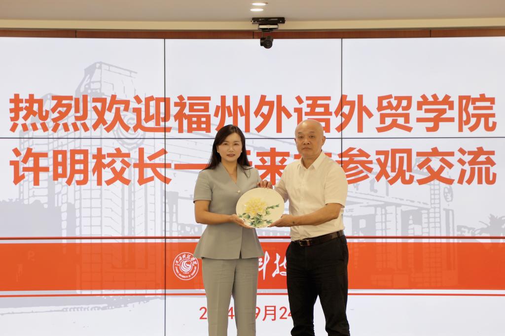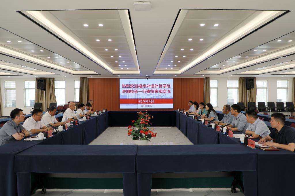 江科网讯(记者 何强江)9月24日,福州外语外贸学院校长许明,纪委书记、副校长、工会主席季祖强等一行7人来校考察交流。我校校长张海涛,副校长林素君、陈辉等校领导热情接待来宾。双方在行政南楼第七会议室举行座谈交流会。