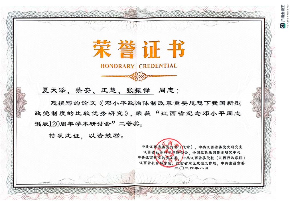 江科网讯(记者 何钰馨)日前,从省委宣传部获悉,由我校江西省区域发展研究院办公室主任夏天添、财经学院专任教师王慧等教师共同撰写的论文《邓小平政治体制改革重要思想下我国新型政党制度的比较优势研究》,荣获“江西省纪念邓小平同志诞辰120周年学术研讨会”二等奖。夏天添老师作为获奖代表受邀参加研讨会。
