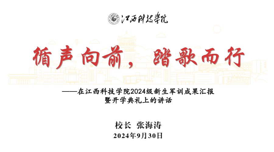 今年,学校的招生宣传片主题为《循声》,这是一个充满力量的词汇,既是物理上的声音传导,更是心灵上的指引,是一种自我超越的呼唤。当同学们与江科相遇时,这个声音便有了回响。今天的开学典礼,是我们走进江科、爱上江科的一段华美的前奏,在未来大学四年的逐梦之旅,我们将共同努力谱写一首属于自己的青春序曲。此刻,我希望用三句话鼓励大家找准基调、循声向前: