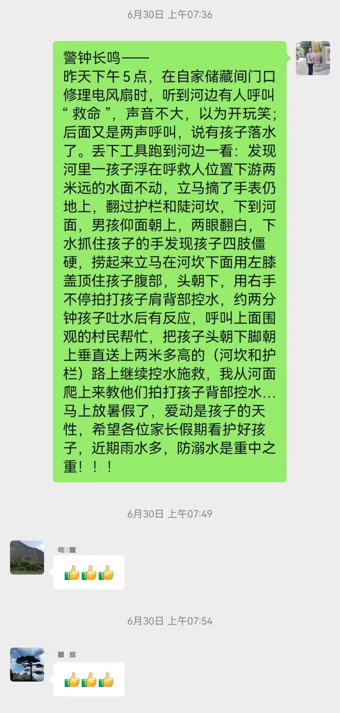 据他回忆,今年6月29日下午5点左右,正在自家储藏间门口修理电风扇的李国根,突然听到河边传来“救命”的疾呼声,便立刻丢下工具,飞奔到河边查看。只见在呼救人位置下游两米远的水面,有一个孩子漂浮着一动不动。“当时男孩仰面朝上,两眼翻白,四肢完全僵硬。”李国根见状连忙下水将孩子捞起,在河坎下用左膝盖顶住孩子的腹部,让孩子头朝下,同时不停拍打孩子的肩背部进行控水。“控了大概两三分钟,小孩子有反应了,我立马就叫上面的村民帮忙,将孩子头朝下脚朝上垂直送上了上去。”由于抢救及时,孩子送医救治后已经没有大碍。