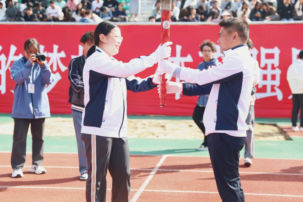 入场式后,本届校运会火炬传递接力开始。这一刻,整个奥体中心一片沸腾,现场掌声、欢呼声此起彼伏。火炬由校领导、优秀教师代表、优秀学生代表沿奥林匹克中心跑道依次接力传递,张海涛校长接过最后一棒火炬,点燃第二十五届校园运动会主火炬台,与圣火一同见证青春的激情。