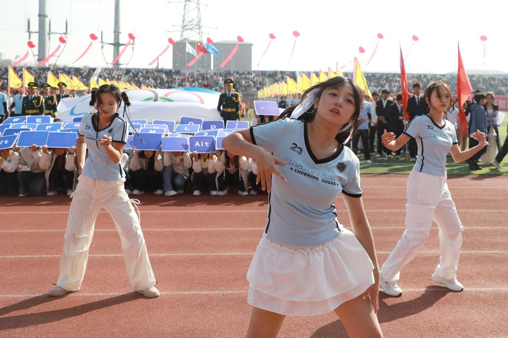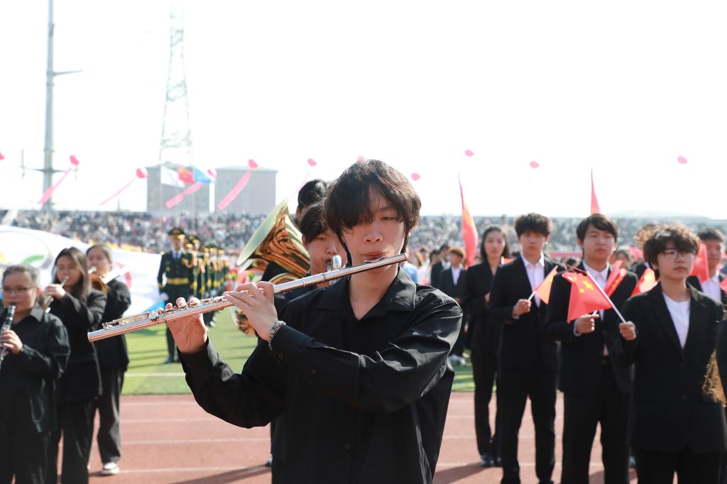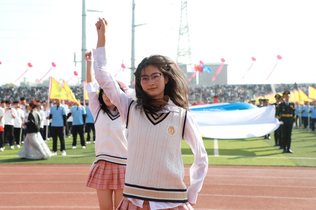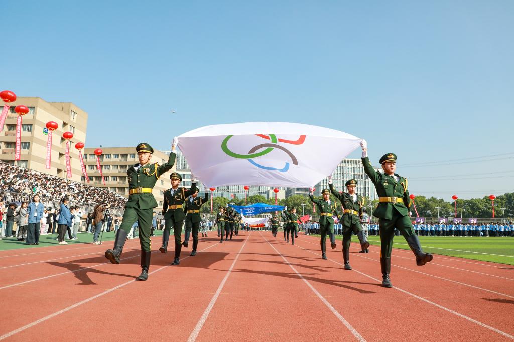 在全场师生的注视下,军政教导队迈着铿锵的步伐护卫国旗入场。当庄严的国歌声响起,鲜艳的五星红旗在奥林匹克中心运动场上冉冉升起。