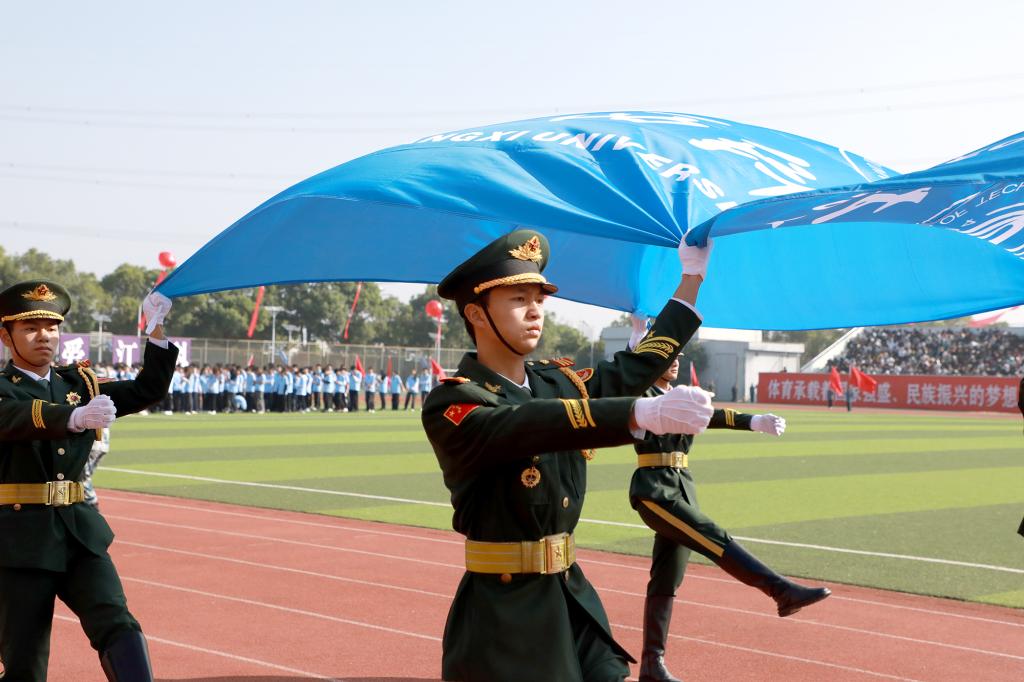 五环旗、校旗、会徽、彩旗方阵、教职工运动员代表方阵、各学院运动员代表方队入场