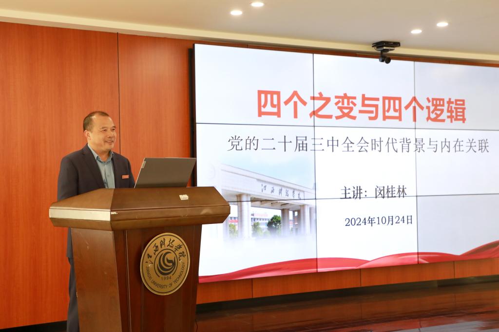 闵桂林副校长以“四个之变与四个逻辑——党的二十届三中全会时代背景与内在关联”为主题作首场宣讲。他从“百年变局:四个之变”“伟大复兴:四个逻辑”两个部分,结合国内外实事案例,深入浅出阐述了百年变局与伟大复兴的丰富内涵。他表示,立足中国式现代化新征程,全面审视进一步全面深化改革的时代方位,需要以大历史观观照现实,需要以新的战略观审视进一步全面深化改革,需要以新的发展观审视进一步全面深化改革,需要紧扣中国式现代化,不断深化对全面深化改革的规律性认识,从历史经验中汲取智慧,以钉钉子精神把全会部署的各项改革任务落到实处,促进改革与发展良性互动。