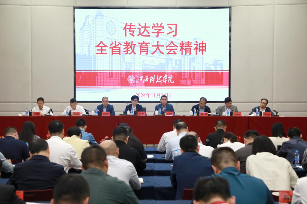 江延湖书记传达全省教育大会精神。他指出,全省教育大会深入学习贯彻党的二十届三中全会精神和习近平总书记关于教育的重要论述,全面落实全国教育大会部署要求,总结近年来大力实施科教强省战略推动教育事业发展取得的成效,部署加快建设高质量教育体系的重点任务,充分体现省委、省政府对教育工作的高度重视和殷切期望,耕耘在教育战线的我们深受鼓舞、倍感振奋,深感使命光荣、责任重大。江延湖书记强调,要充分认识全省教育大会对建设教育强省,办好人民满意的教育的重大意义,认真组织抓好学习宣传贯彻工作,把思想认识转化为真抓实干的动能。要认真研读。作为教育工作者,要做胸怀国之大者的大先生,跳出教育看教育、立足全局看教育、放眼长远看教育。要认真学习。全校中层干部正处于干事创业的黄金时期,要有“本领恐慌”的危机意识,怀着知不足的空杯心态,将学习摆在首位。要认真思考和规划。要持续推进“三力”建设,做到人无我有、人有我优、人优我特、人特我专。