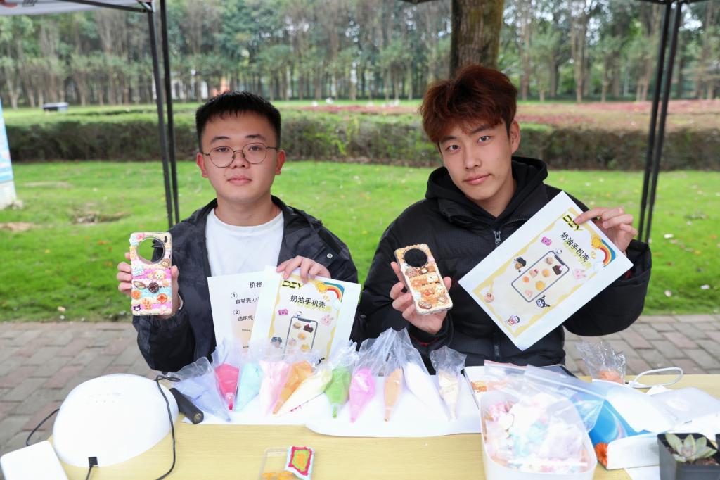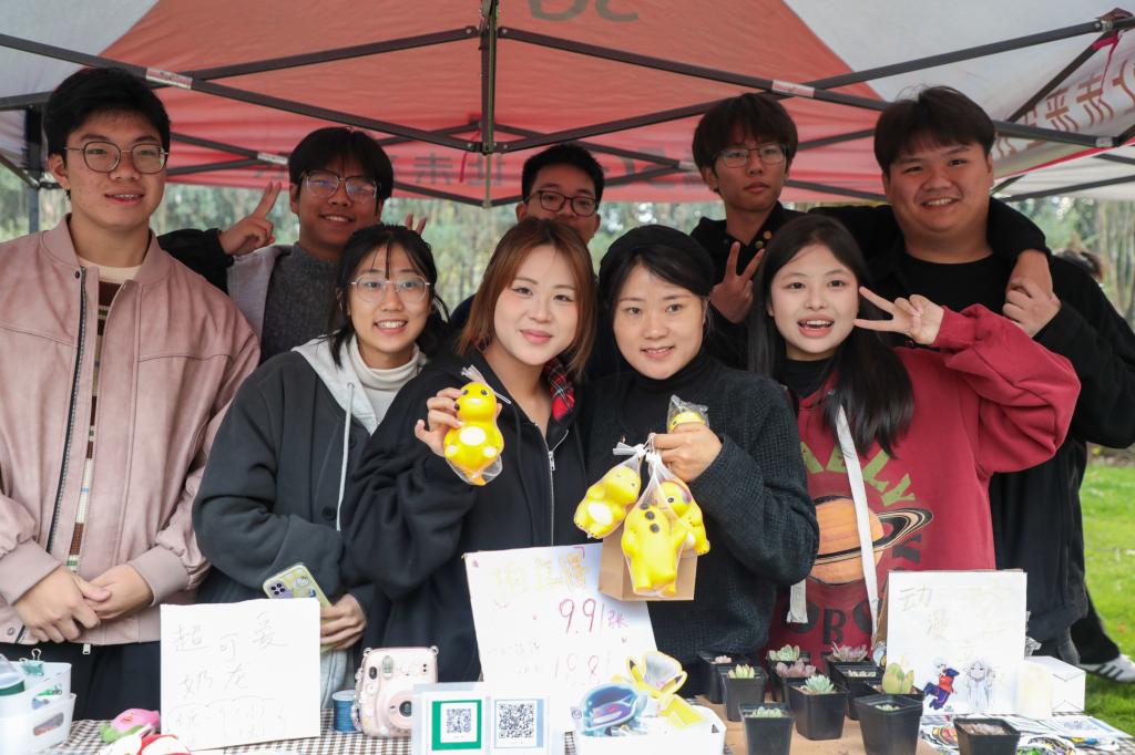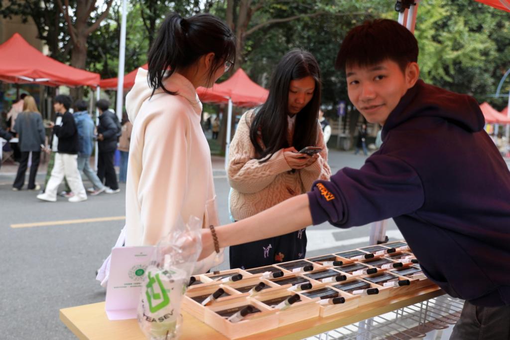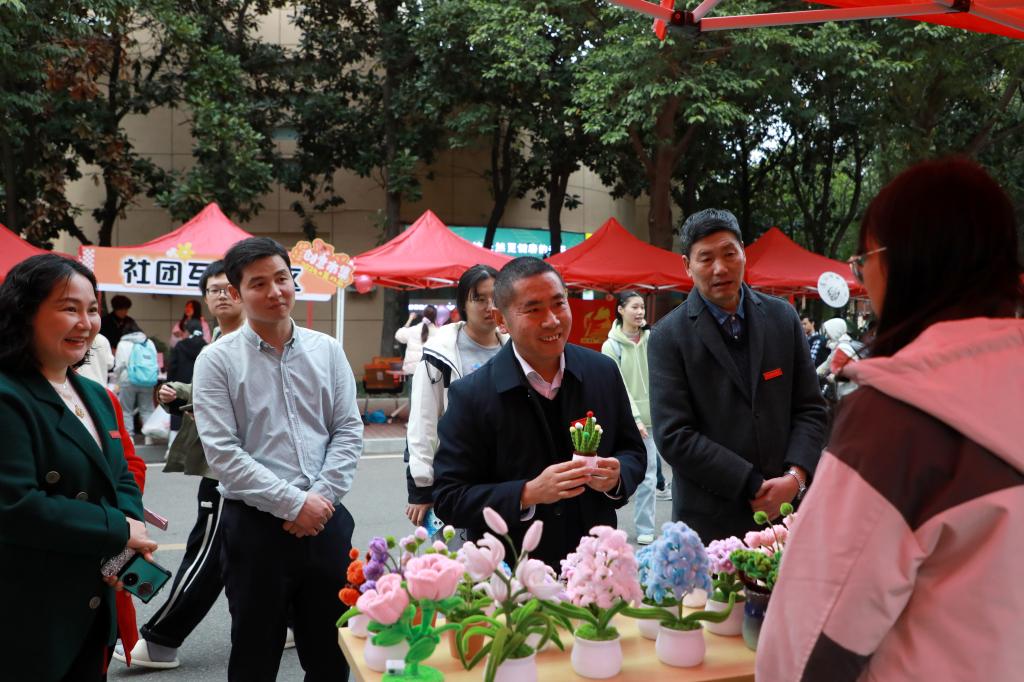 同学们三五成群,脸上洋溢着欢笑与兴奋。逛摊位、尝美食买好物、学手艺、交朋友……在市集上,同学们可以找到心仪的“淘品”,也可以找到与他人分享的那份喜悦。整个集市就是为同学们展现创新精神、实现创新梦想而搭建的舞台。“这个针织品是自己做的吗?”“你这个创意很不错!”“我建议你们可以将这个和现在同学们的喜好结合起来。”江延湖书记、夏拥华副书记穿梭在各个摊位前,与“摊主”们亲切交流,聆听大家的“商品”介绍,鼓励大家继续发扬创新创业精神,在创新创业实践中增长才干,不断突破自我、锐意进取、善作善成。