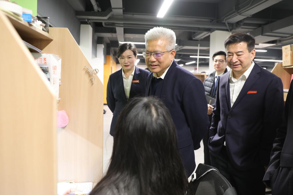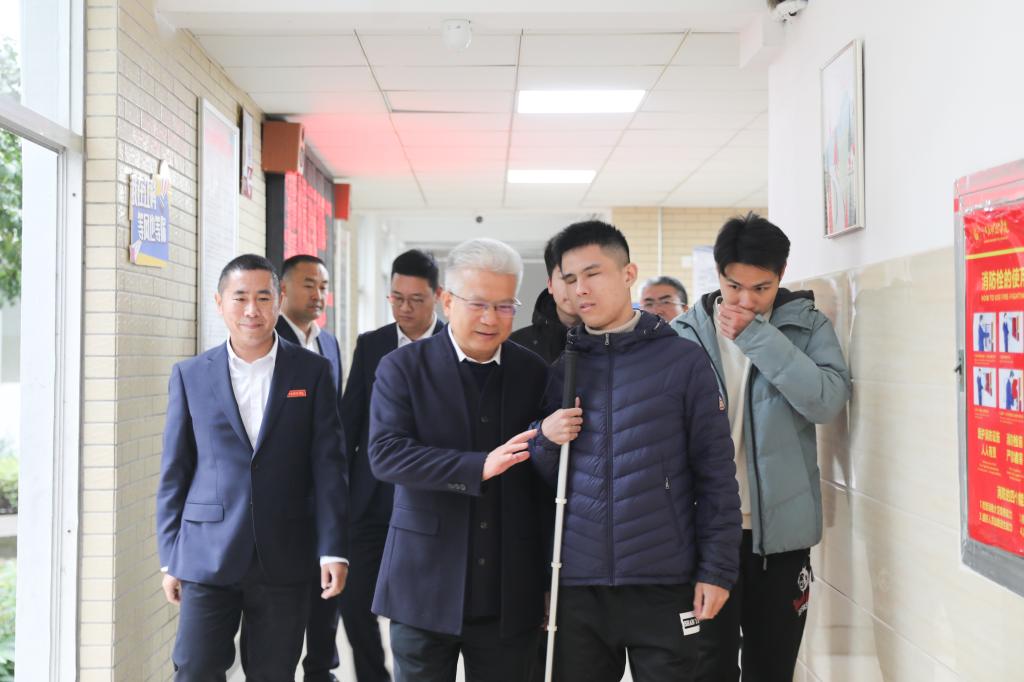在由宿3栋装修改造而成的折桂自习室,汪立夏副厅长高度赞许学校打造的嵌入学生公寓“一站式”研学空间,认为学校能充分满足学生需求,因地制宜,为学生们积极打造温馨、便捷、舒适、高效的学习生活环境。“昨天你在‘爱我国防’主题演讲大赛中的表现很棒,恭喜你荣获亚军!”在黄镇宇同学宿舍,汪立夏副厅长关心关怀黄镇宇和室友的生活情况,黄镇宇同学则向汪立夏副厅长展示了学校创办人于果向自己捐赠的盲文书籍并分享了独自旅行中的趣闻。在井冈山食堂窗口,汪立夏副厅长仔细观察菜品颜色及种类,详细询问菜品价格及质量,向正在用餐的同学了解对学校食堂的满意度。