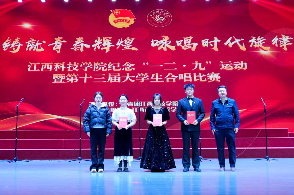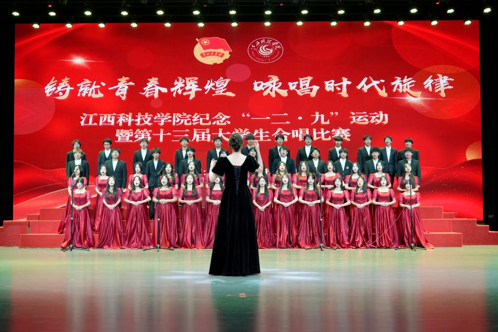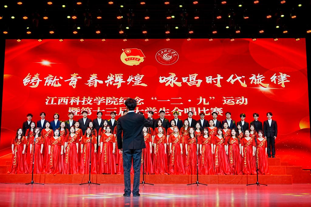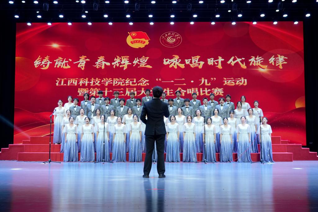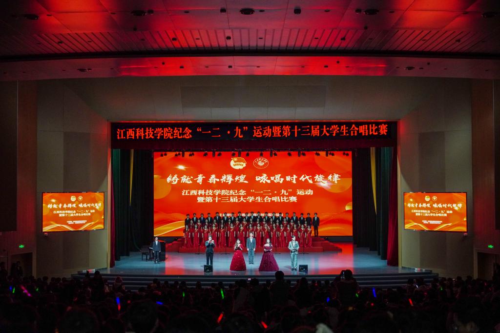 江科网讯(记者 何强江)12月9日晚,蓝海大剧场灯火通明,歌声悠扬,江西科技学院纪念“一二‧九”运动89周年暨第十三届大学生合唱比赛在这里举行。近700名青年学子汇聚一堂,以声传情、以歌咏志,激情唱响爱国主义时代强音。