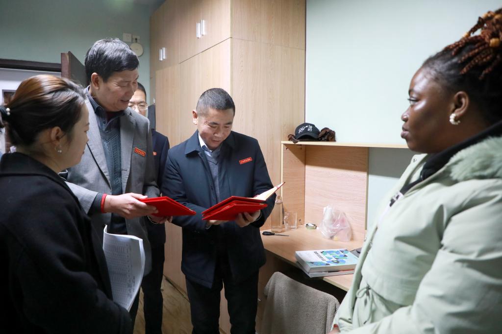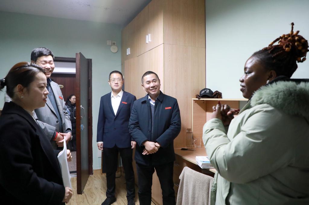 座谈会前,江延湖书记一行深入留学生公寓,向留学生送去冬日里学校的关怀与温暖。“在留学生宿舍管理中有没有遇到什么困难?”“你来自哪里?”“在中国生活得还习惯吗?”“对学校各方面有什么建议?”江延湖书记详细了解学生生源国家、中文水平与学习生活情况、住宿环境、基础设施以及消防安全情况,并与值班辅导员、宿管人员和留学生亲切交谈,鼓励留学生注重中文学习,融会贯通,积极做中外文化交流的友好传播者。他强调,留学生作为学校整体的一部分,为学校注入新动力、新血液、新视野,做好国际学生管理与服务责任重大,意义非凡。宿舍作为留学生学习、生活的重要场所,安全管理工作至关重要,学院要切实保障好他们日常学习、生活中的各项需求;要定期与他们谈心谈话,实时掌握留学生的身体、心理状态,做到心中有数;要加强安全管理,切实做好留学生公寓的安全排查工作,对于可能存在的风险认真研判,及时做出整改措施,打造一个安全、舒适、整洁、温馨的居住环境。