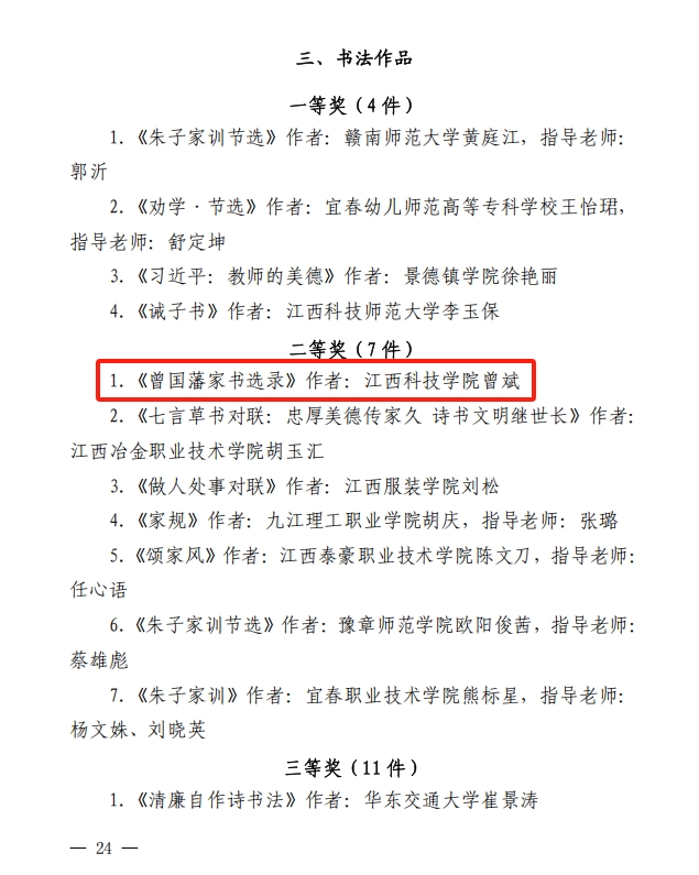 江科网讯(记者 杨泳慧)近日,由省精神文明建设办公室、省教育厅、省妇联、省关工委联合开展的以“颂家风 传美德 耀赣鄱”为主题的家风系列项目大赛圆满落幕,我校教育学院曾斌老师的作品《曾国藩家书选录》荣获书法类二等奖。